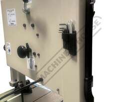 This bandsaw has a welded steel frame designed to keep your machine from twisting whilst cutting at 340 x 225mm capacity. It has a generously 545 x 515mm cast iron table with an aluminium rip fence and mitre guide to help you cut straight or angles to the required size. The table mounting trunnions are adjustable to get your tale to tilt from 90 to 45 degrees and has a quick action locking lever. This machine also has its own LED light that is mounted to a flexible arm so the light can be adjusted direct on the cutting line no matter what timber size you are cutting.