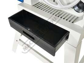 The dust extraction port located at rear of machine will remove most of your internal dust once connect to your dust extractor; and whatever the extractor does not collect the removable tray built into the stand will collect the rest. The 2-speed pulley system rotates at 370 or 800m/min and his driven by a nicely matched 1100W / 1.5hp 240V motor