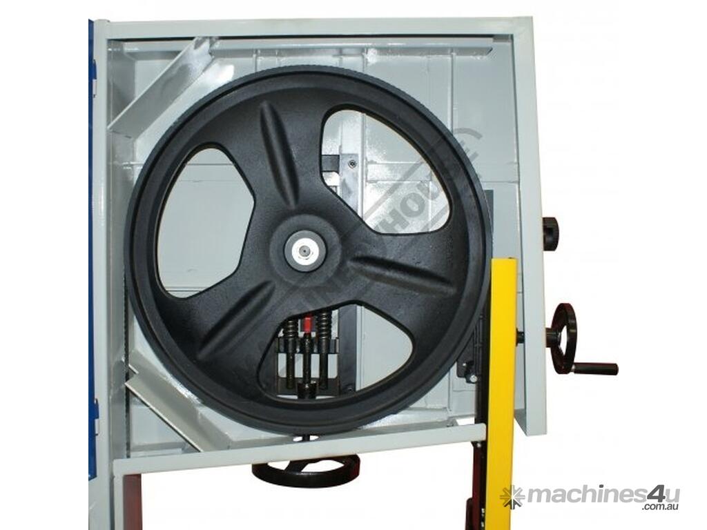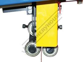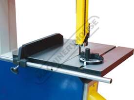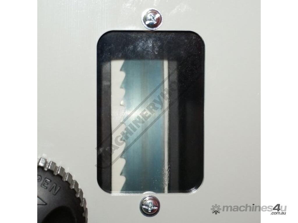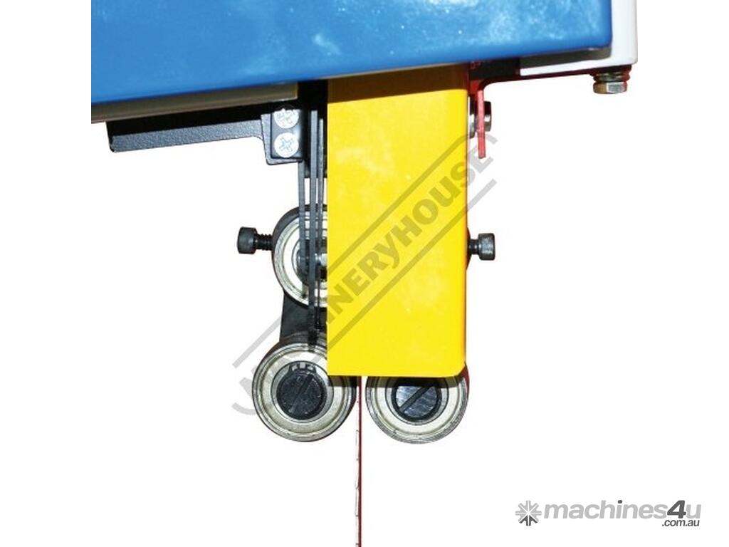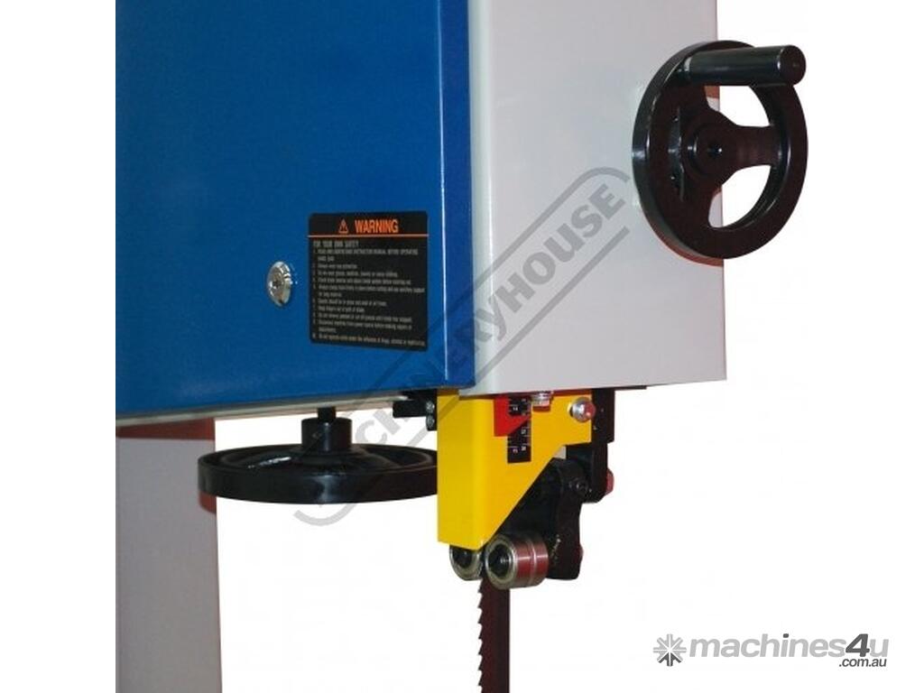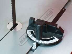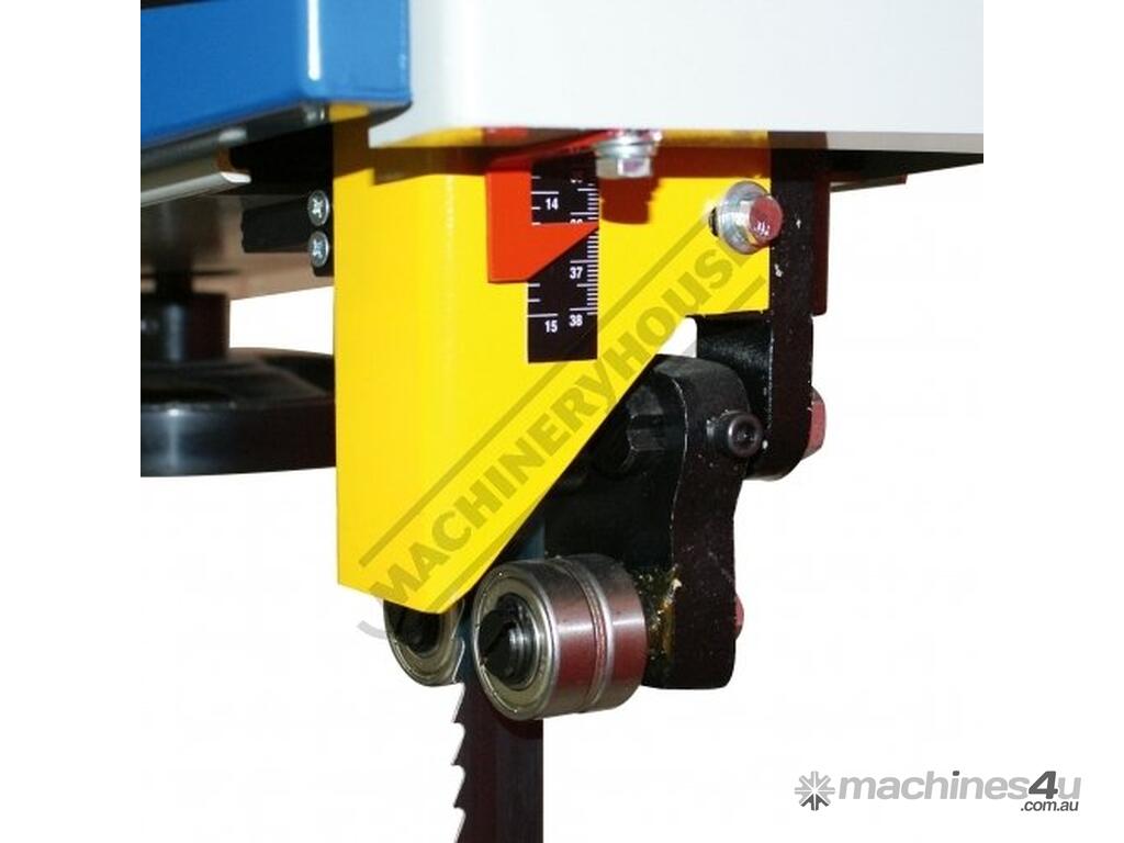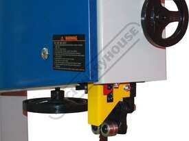 The 10 ball bearing blade guide system, 5 located on the adjustable height guide & 3 below the table offer outstanding blade accuracy that is required in a heavy duty machine. Also fitted are cast iron trunnions that offer a solid table mounting base and allows the table to tilt and be securely locked into place for those jobs that require angle cuts. The worm gear system for the blade guide post movement is used for quick and easy height adjustment settings. Safety features like magnetic power switch & tamper proof door interlock micro switches are fitted to this machine providing peace of mind for the operator.