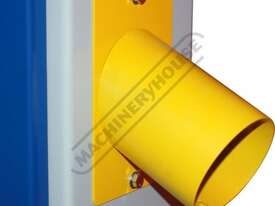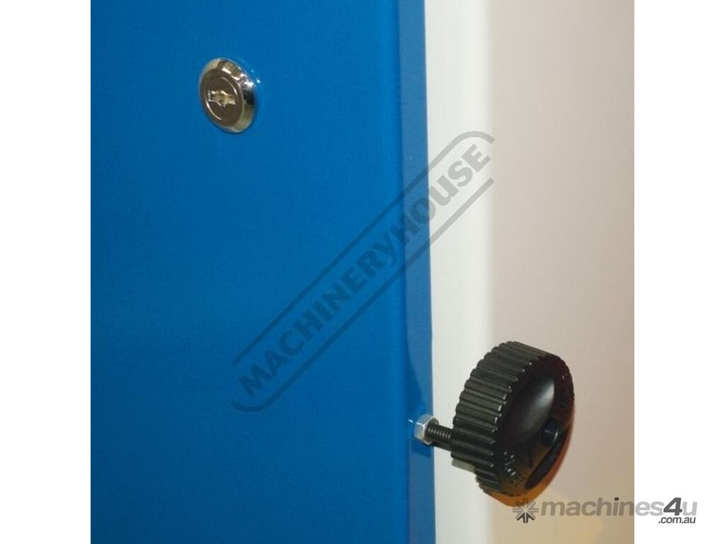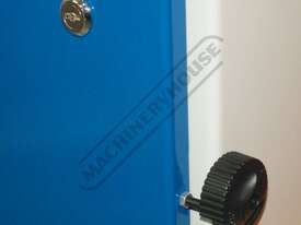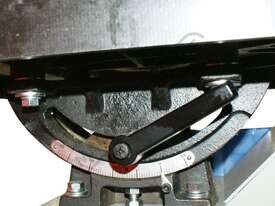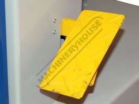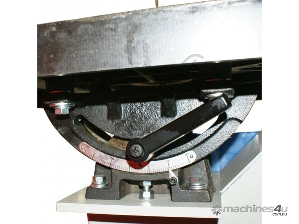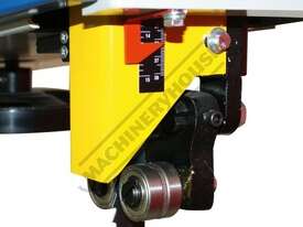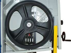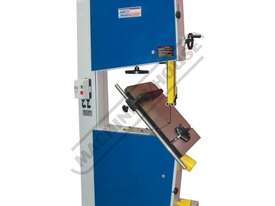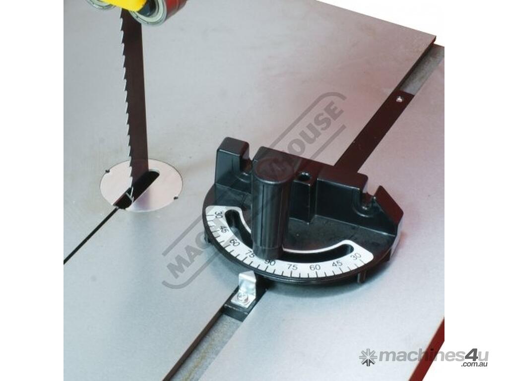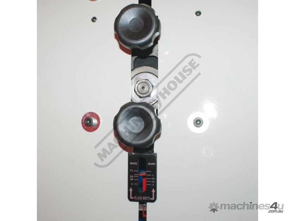 The 10 ball bearing blade guide system, 5 located on the adjustable height guide & 3 below the table offer outstanding blade accuracy that is required in a heavy duty machine. Also fitted are cast iron trunnions that offer a solid table mounting base and allows the table to tilt and be securely locked into place for those jobs that require angle cuts. The worm gear system for the blade guide post movement is used for quick and easy height adjustment settings. Safety features like magnetic power switch & tamper proof door interlock micro switches are fitted to this machine providing peace of mind for the operator.