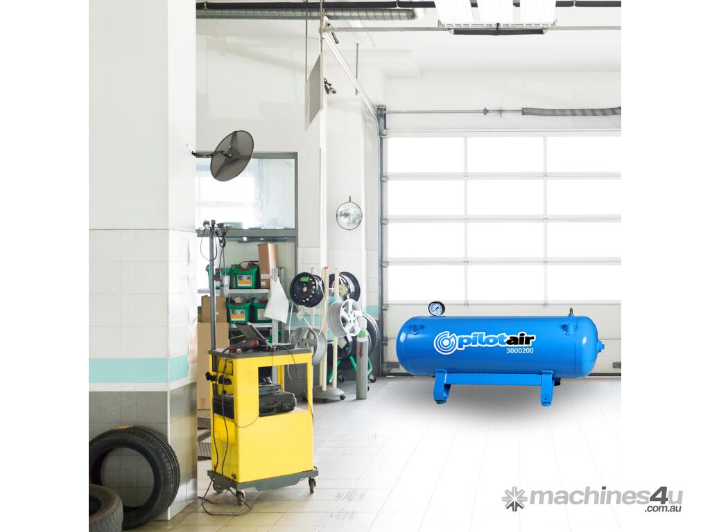 The Pilot 3000200 horizontal Compressed Air Storage Tank. Coated in industrial grade enamel, manufactured in accordance with AS1210 and comes with the manufacturer's data report. It comes standard with a safety valve, pressure gauge, and manual condensate drain, offering a reliable compressed air storage solution.