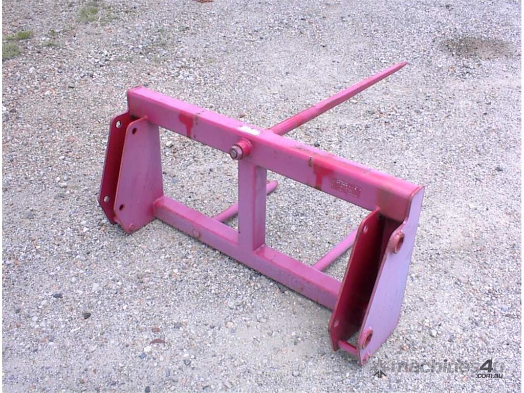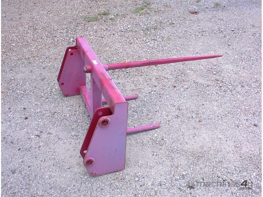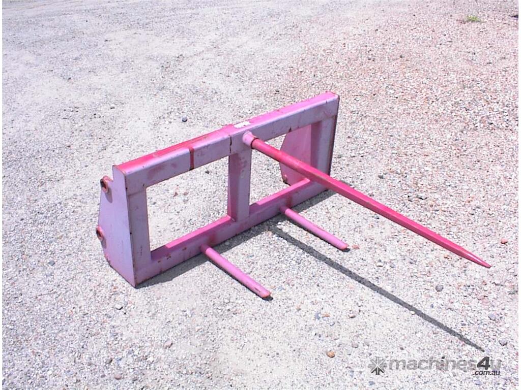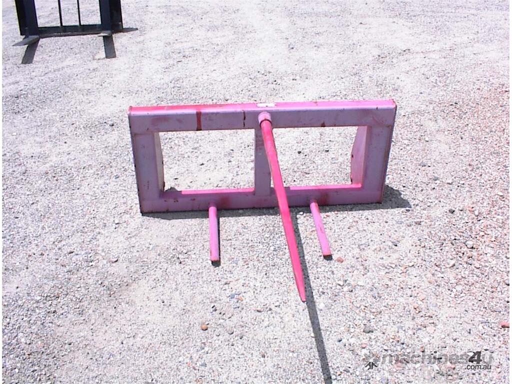 Bale spear attachment, unused, 1200mm wide carriage x 540mm high, main spear 1100mm long, suit tractor loader or small wheel loaders, could be adapted to suit skid steers, 1160mm between ears, 25mm pin holes, 305mm pin centers, 2 units available price each $550 inc gst.