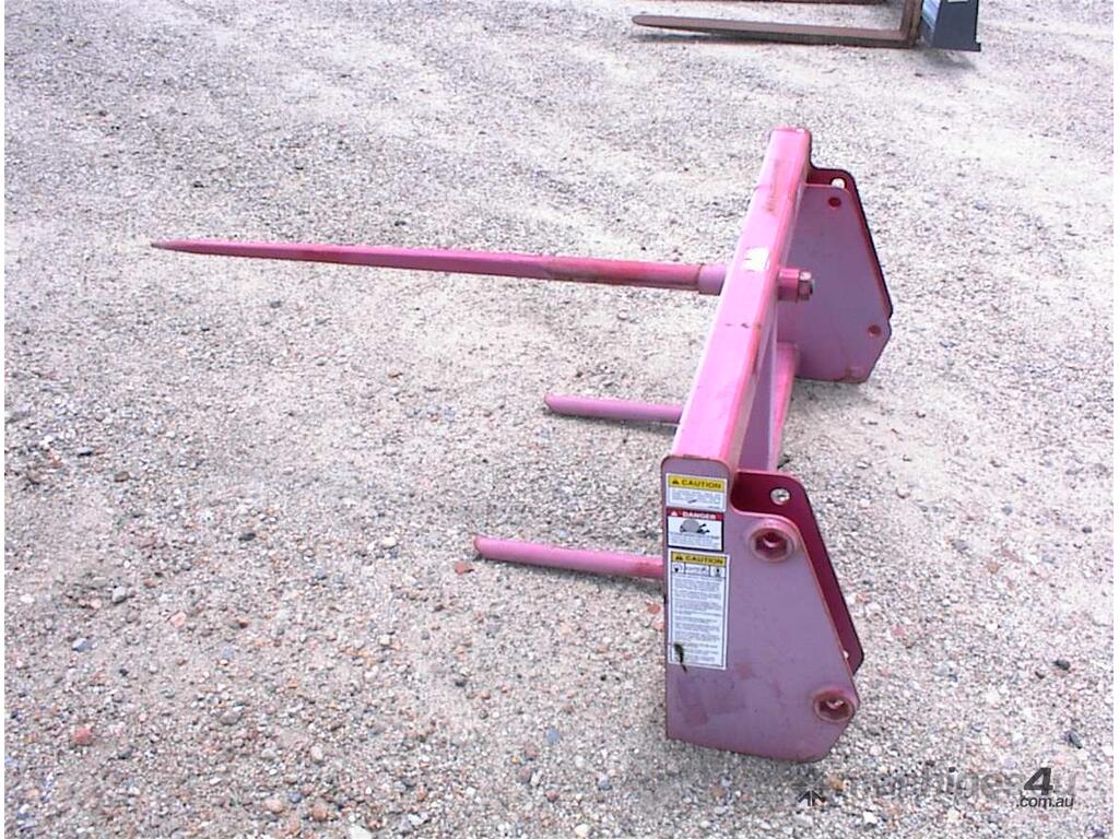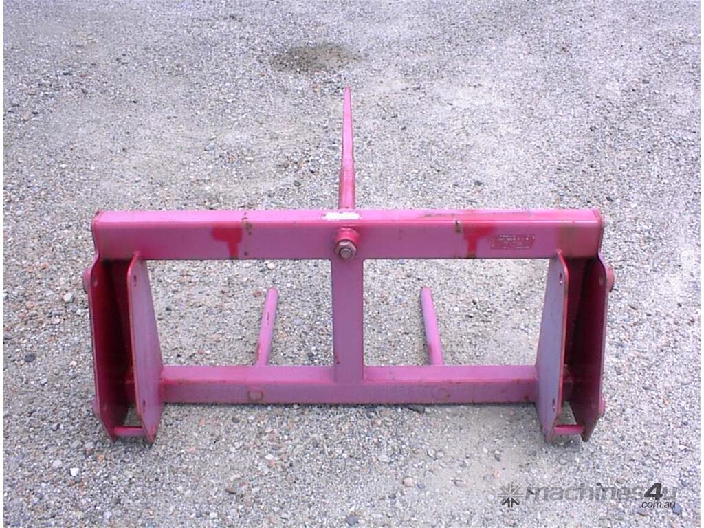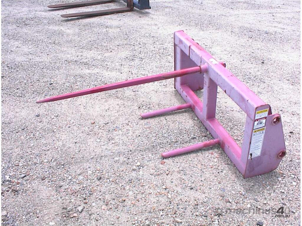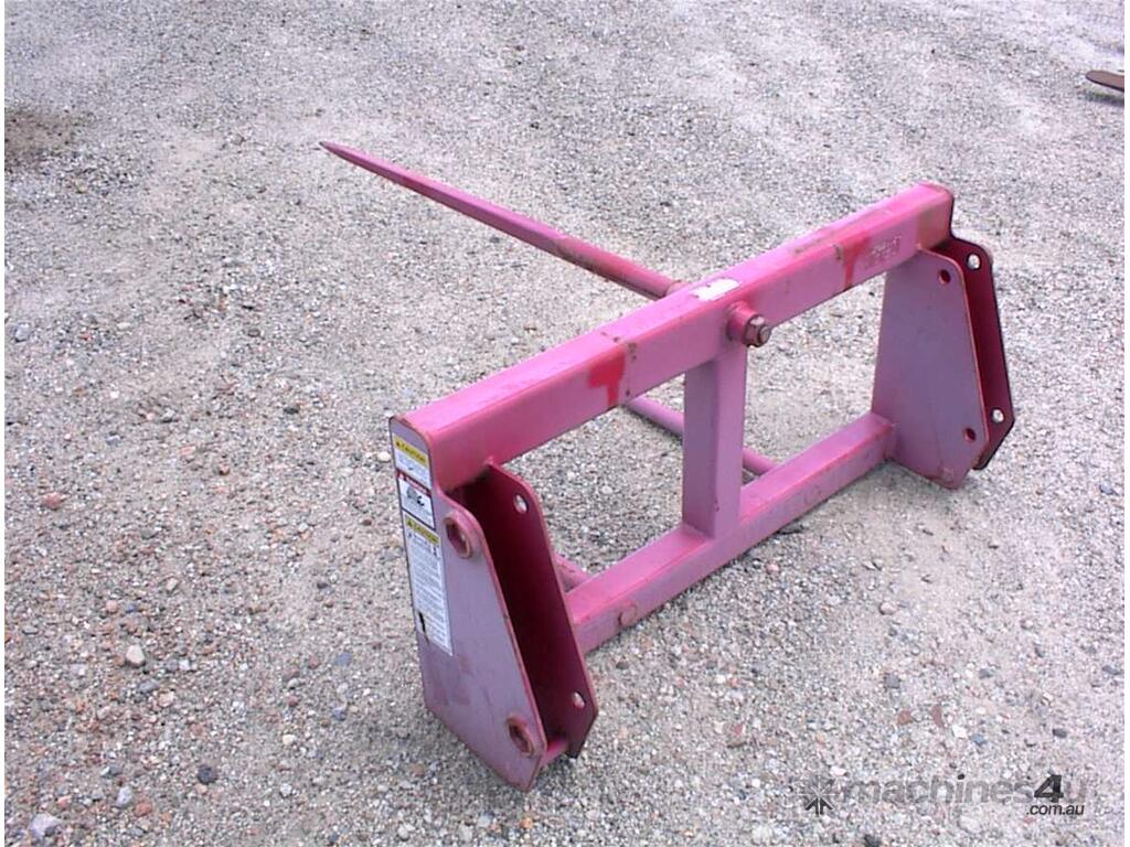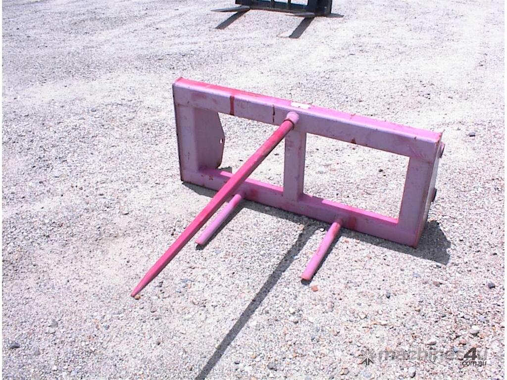 Bale spear attachment, unused, 1200mm wide carriage x 540mm high, main spear 1100mm long, suit tractor loader or small wheel loaders, could be adapted to suit skid steers, 1160mm between ears, 25mm pin holes, 305mm pin centers, 2 units available price each $550 inc gst.