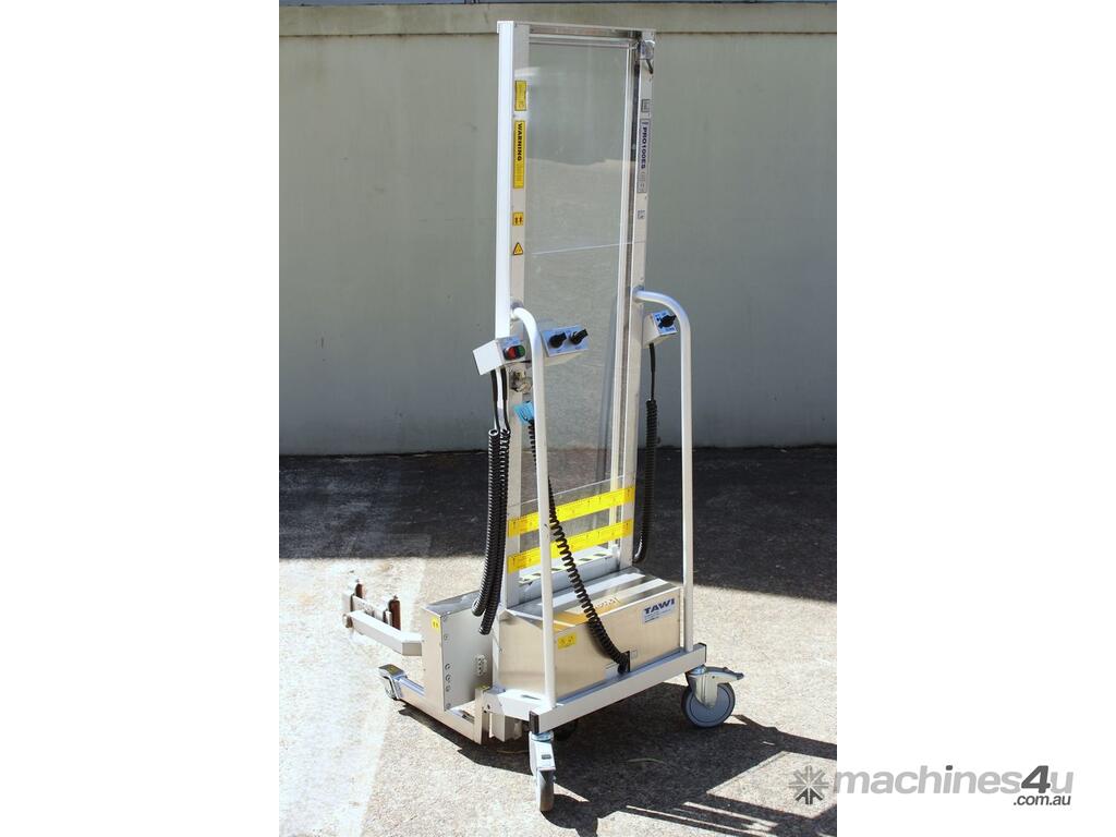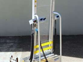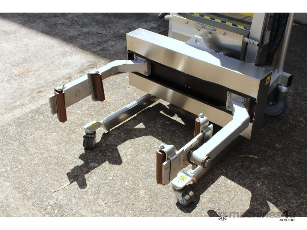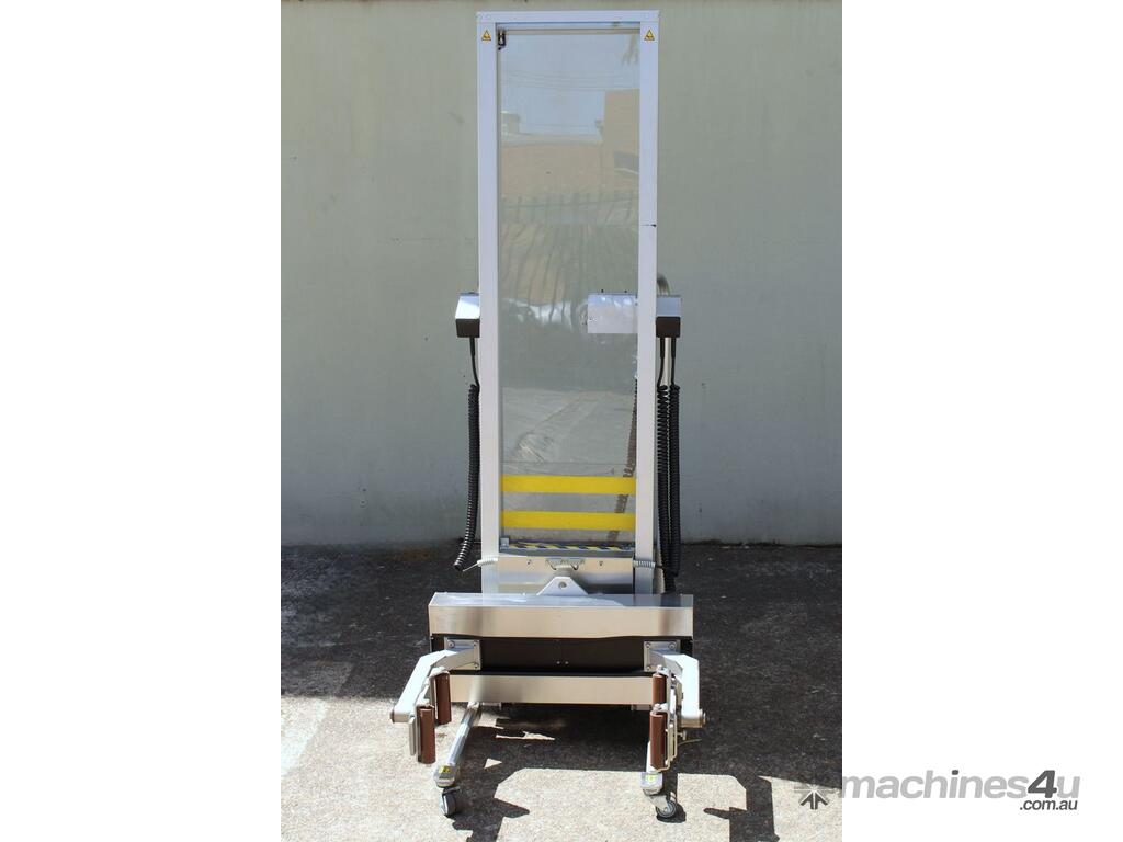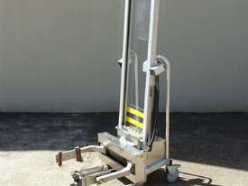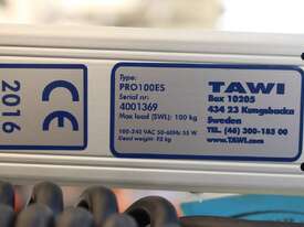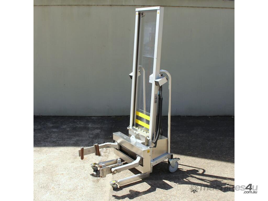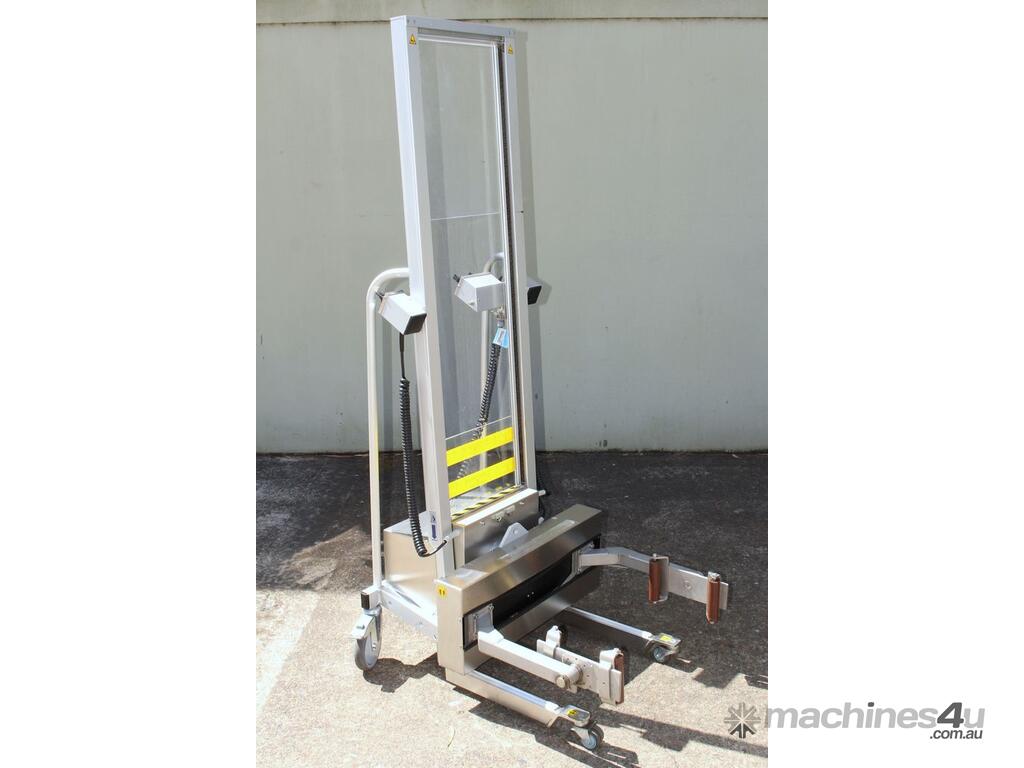 Mobile Drum Lifter, "TAWI" model PRO100ES, max. load capacity 100kgs, designed for handling and lifting small drums, ergonomic stainless steel mobile unit with electric lift and tilt function, suitable for drum transfer and positioning applications in pharmaceutical, food and cleanroom environments, compact and easy to manoeuvre design with safety features for operator control, 240V single phase power supply
