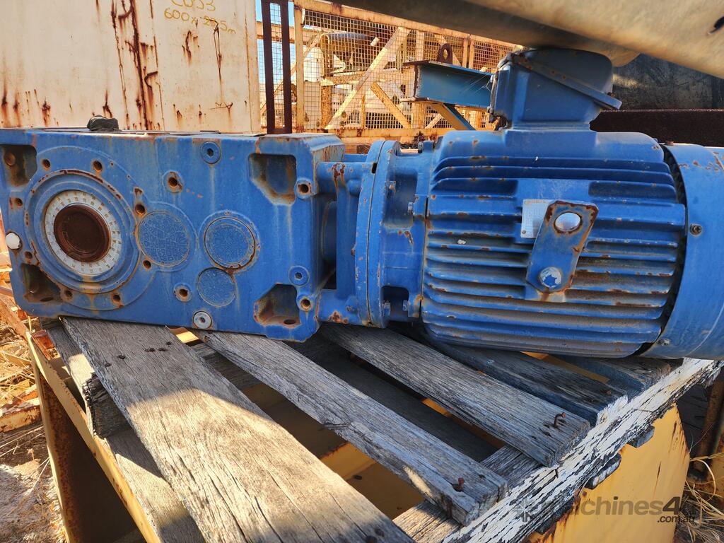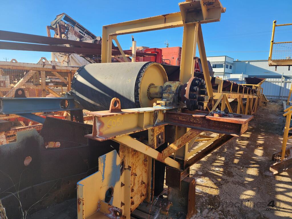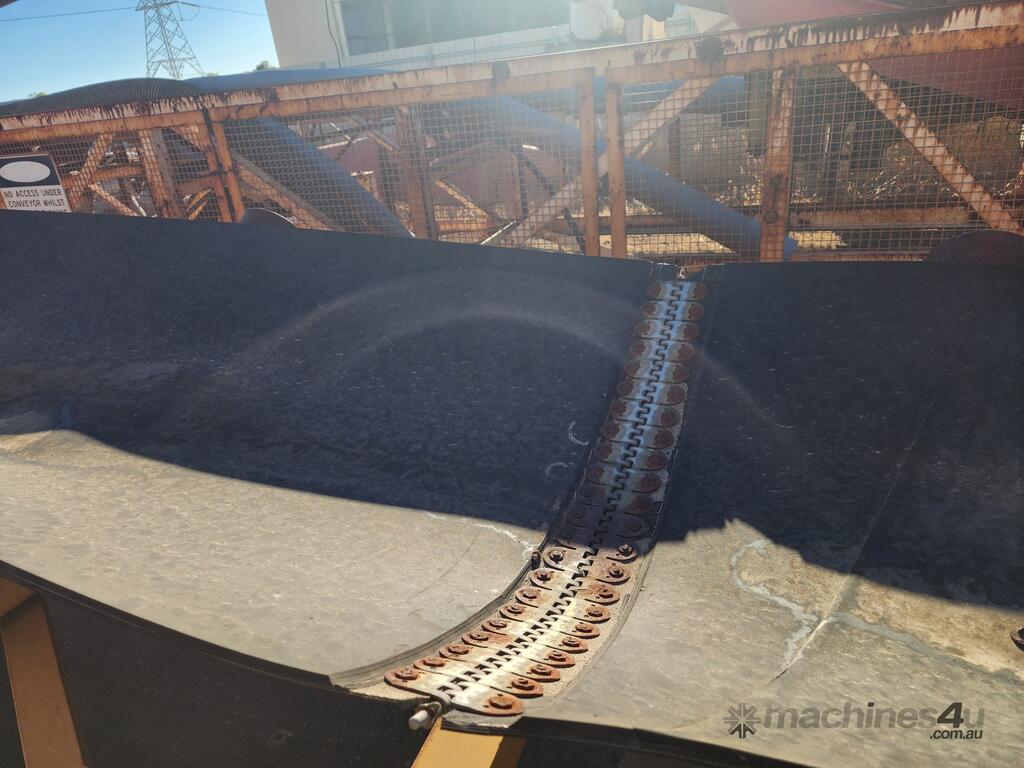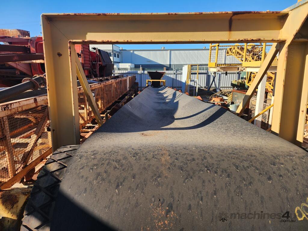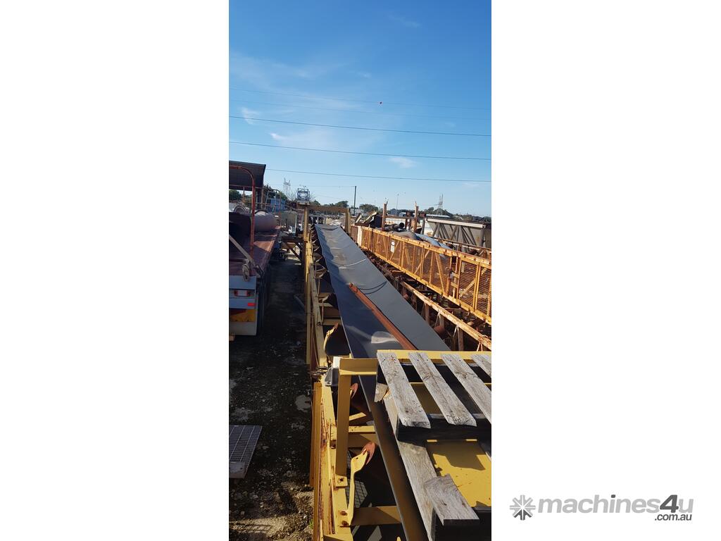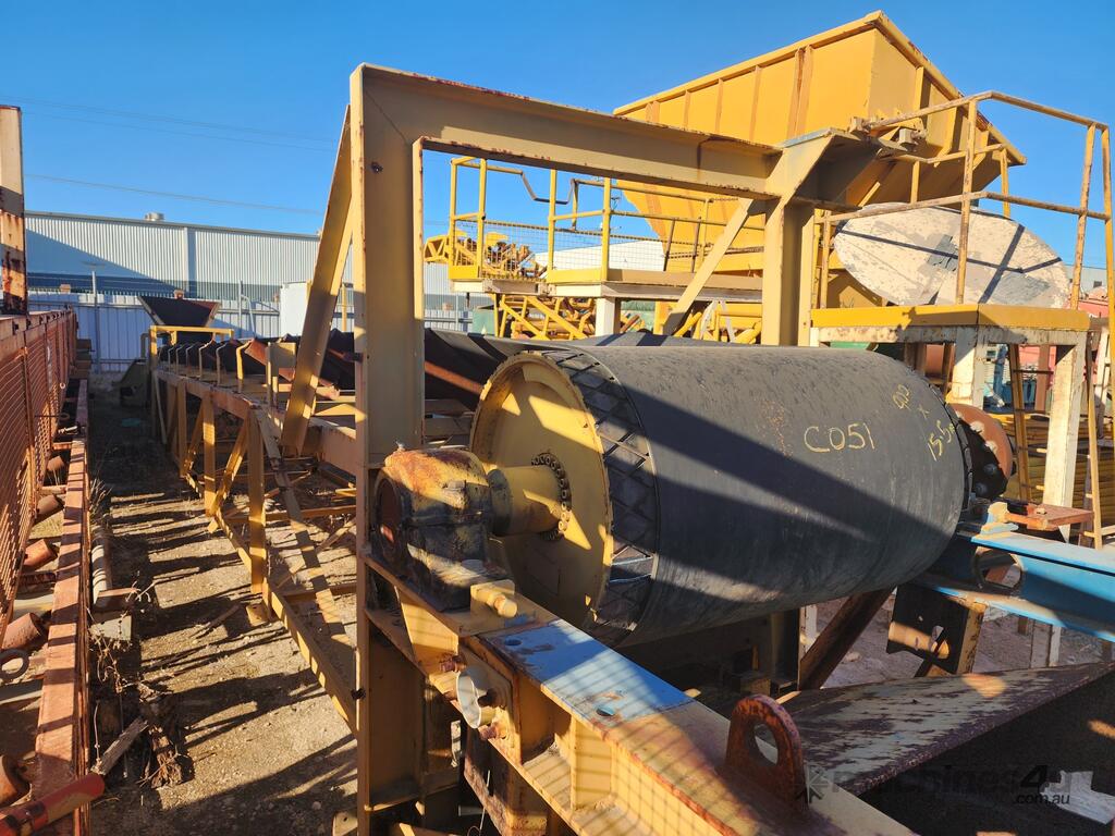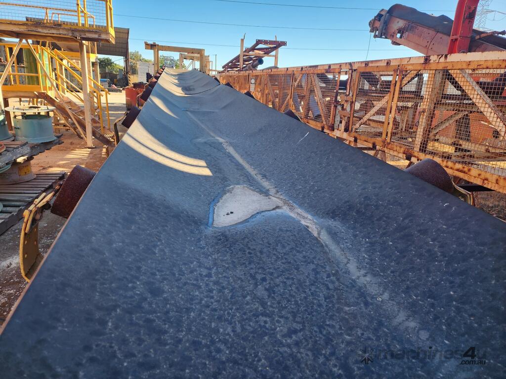 Truss framed conveyor, 900mm wide 3 ply belt in very good condition. 15.5m long. 22kw electric drive. Comes with feed and discharge chutes.