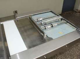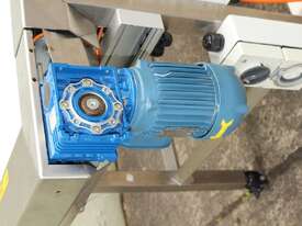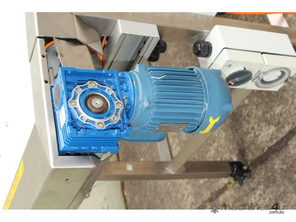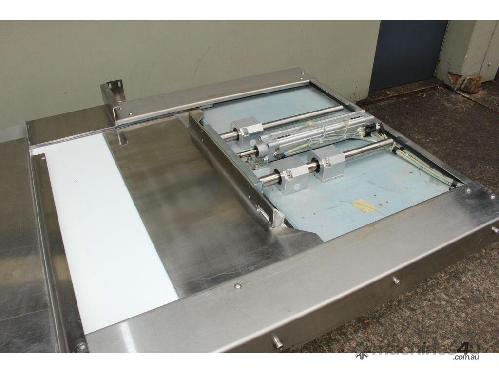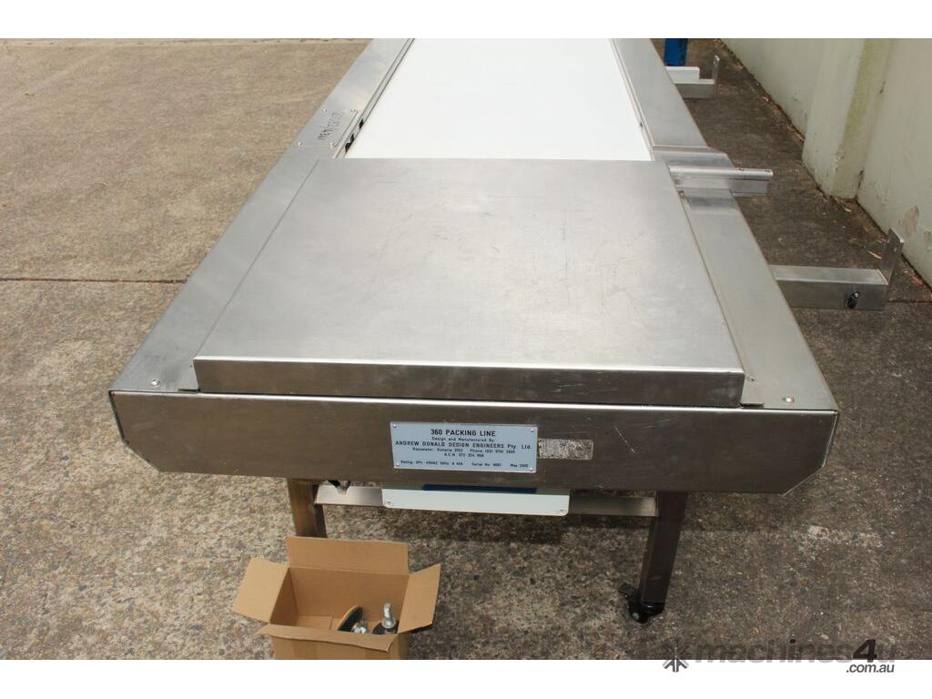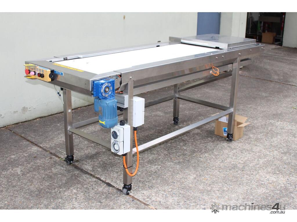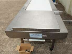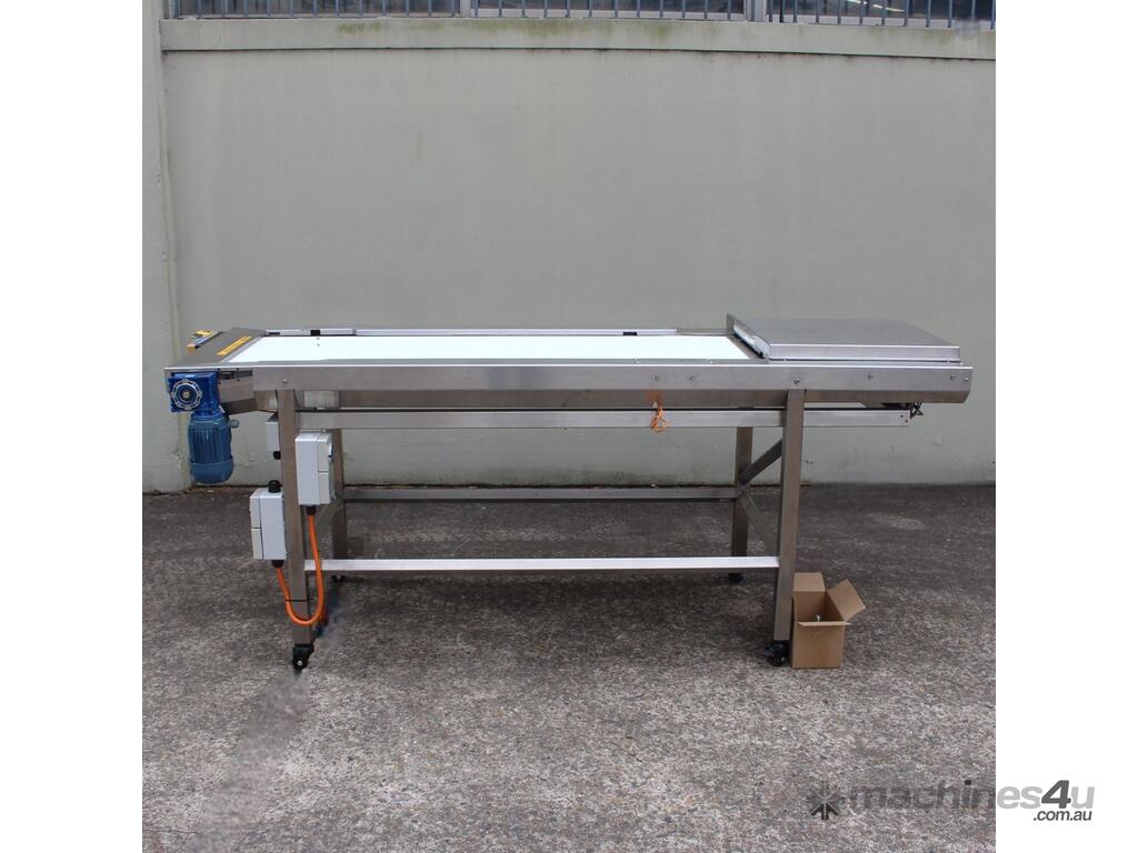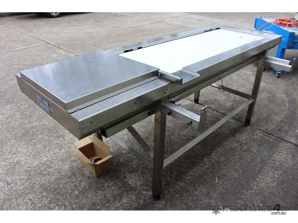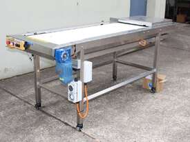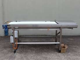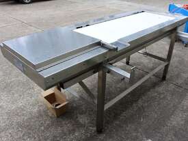 Belt Conveyor, belt size: 560mm wide x 1600mm long, complete stainless steel body, driven by 3 phase 0.18kw geared motor, overall dimensions: 1100mm wide x 2350mm long x 950mm high, previously used as a collection table with mechanised push arms