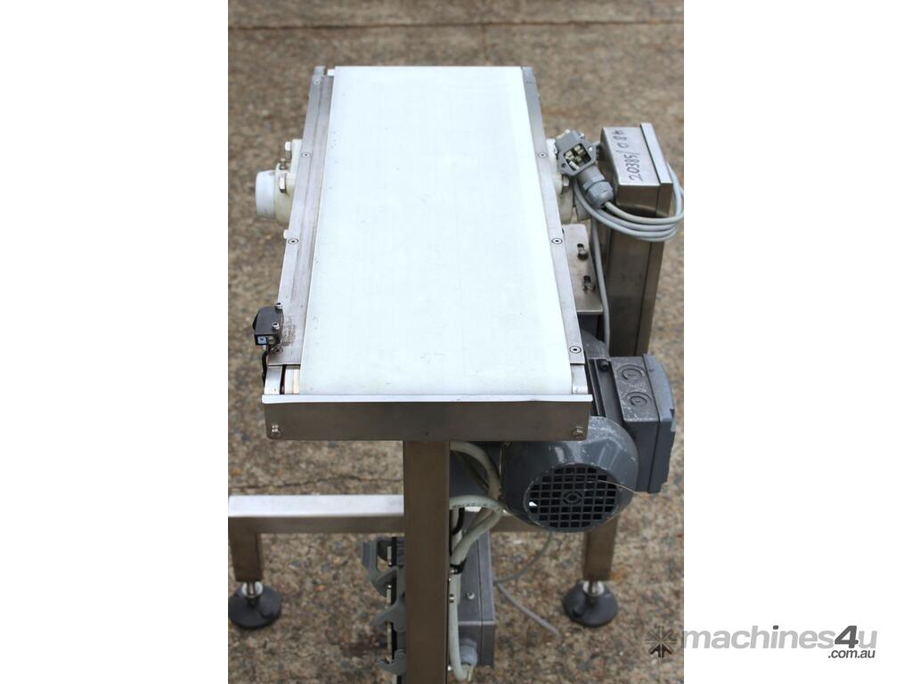 Belt Conveyor, belt dimensions: 550mm long x 200mm wide, stainless steel structure, driven by 3 phase 0.25kw motor