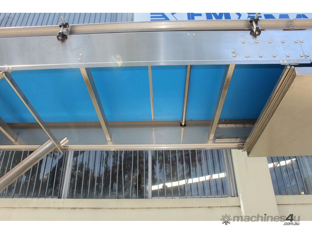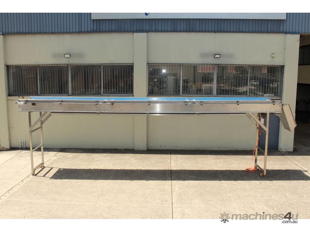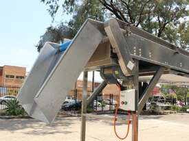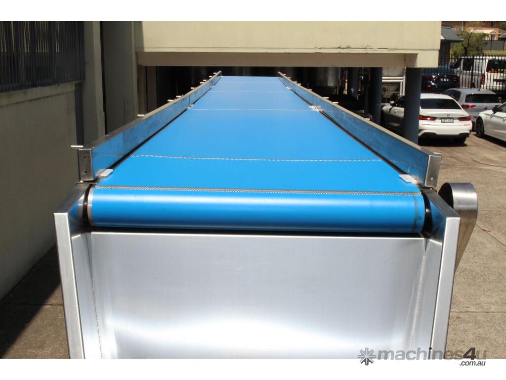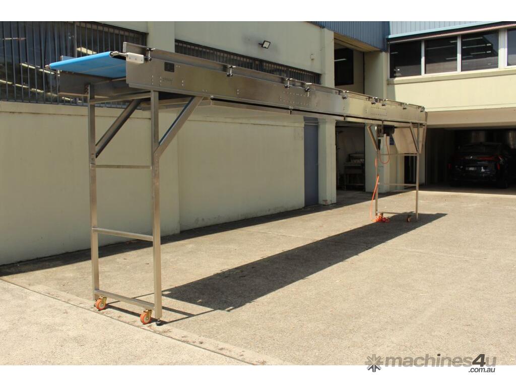 Belt Conveyor, "Gelgoog" model GGDS8000A, 800mm wide x 8000mm long x 2250 height, with discharge hopper, stainless steel frame, mobile, 4 x removble trays, driven by 3 phase 0.4kw geared motor