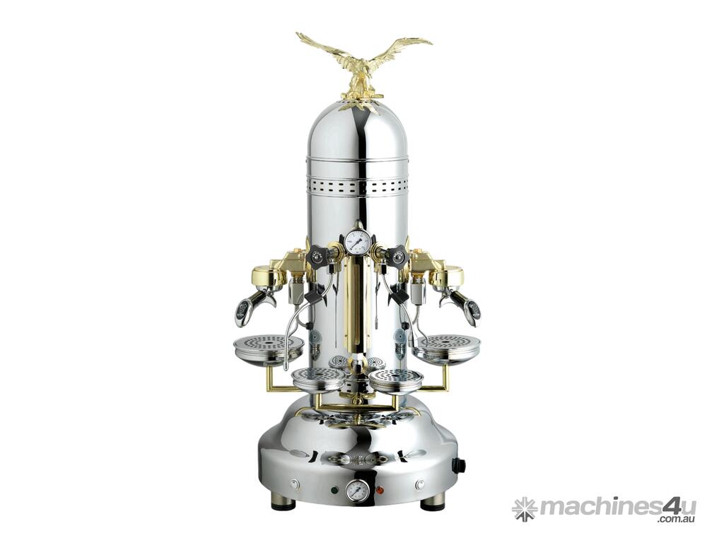 Fast, hot and compact, this espresso coffee machine is built to craft and brew the best espresso for your ultimate satisfaction! This Bezzera model is a faithful replica of the Belle Epoque period espresso machine. The body is hand made from the highest of quality materials whilst the Eagle is available in stunning golden brass that matches the performance of this classical volumetric espresso machine. Key Features: Body: Polished Brass or Chrome Frothing Ability: 3 Litres with 20 second recovery Temperature stability: Dual boiler probe system provides superior safety & greater thermal stability Cup Warmer: Large cup warming station above unit Water/Steam: Fully flexible chromed copper steam and water arms Boiler Refill: Automatic boiler refill, plus safety cut out to prevent damage Optional 3~N available on request Additional Information: Boiler Capacity: 11L Colour: Silver (Stainless Steel) Warranty: 1 Year Parts Only Depth: 500 mm | Width: 740 mm | Height: 1100 mm | Power: 3250W; 15A | Net Weight: 52 | Price: $26990 | Manufacturer: Bezzera | Warranty: 1 Year Parts Only