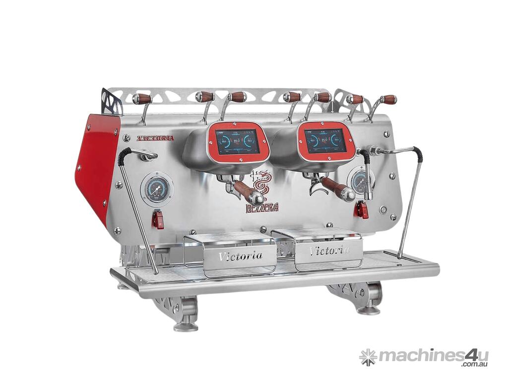 Bezzera VICTORIA Red 2-Group Professional Espresso Machine - BZVICTORIA2R The Victoria coffee machine is a high-performance system tailored for the evolving global coffee industry. Featuring an advanced triple-boiler design, it ensures precise temperature and pressure control for optimal extraction of single-origin or blended coffees. Equipped with user-friendly color TFT touch displays, it offers customizable settings, including Bezzera's patented pressure profile technology for drip coffee and herbal infusions. Its automatic water regeneration maintains water quality, while PID thermostats enable precise temperature adjustments for enhanced coffee aroma and flavor. Built for versatility and excellence, it is a powerhouse for coffee connoisseurs. Key features Multi-boiler system allows to program accurate temperature setting Independent boilers with dedicated on/off switch Each brew unit has its coffee boiler TFT Display programming Patented brewing profile system The double boiler hydraulic system is drawn by a Volumetric dosage Pressure profiles setting from 3 to 11 bar Automatic water regeneration Coffee temperature control by PID thermostat Additional Information Services Boiler: 12L Coffee Boiler : 2X1 Colour: Black/White/Red Load connection: G 3/8" Drain connection: G 3/4" 1 Year Warranty Parts Only Depth: 680 mm | Width: 820 mm | Height: 560 mm | Power: 415V ; 7300W | Net Weight: 100 | Price: $19999 | Manufacturer: Bezzera | Warranty: 1 Year Parts Only