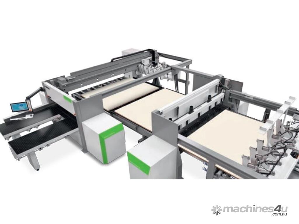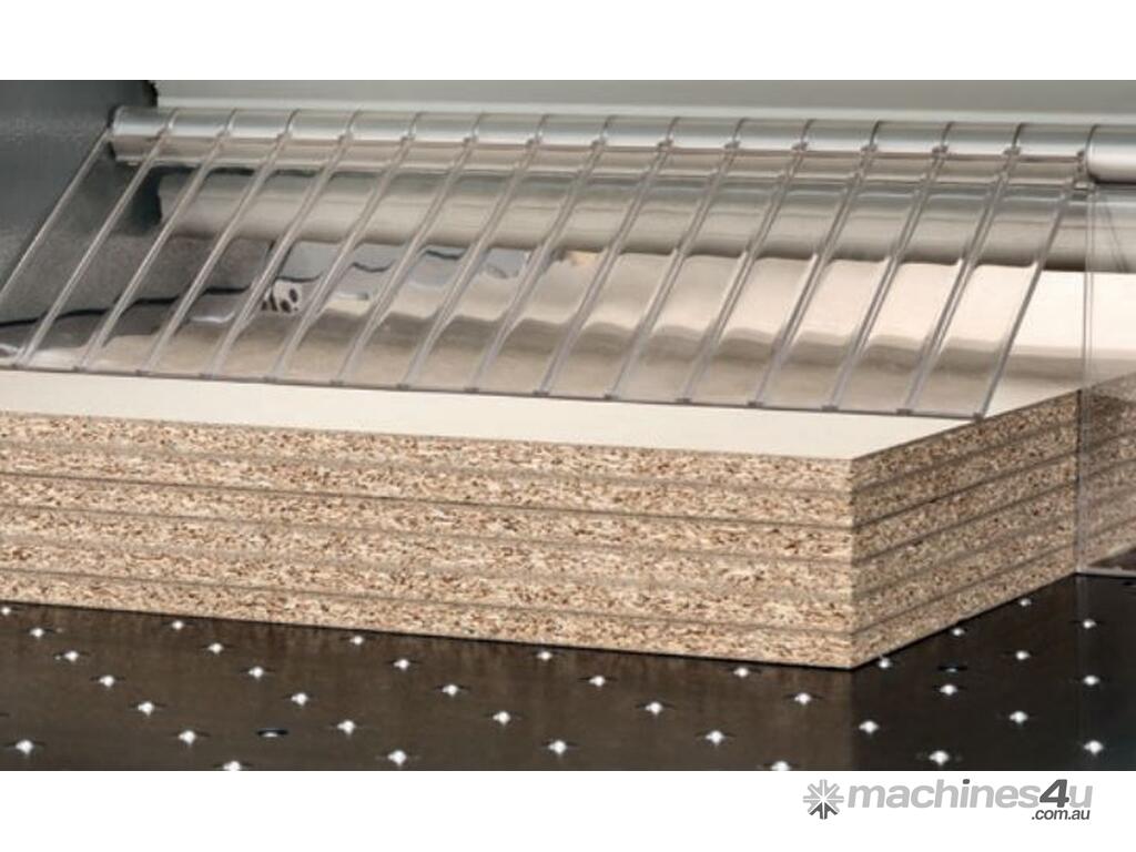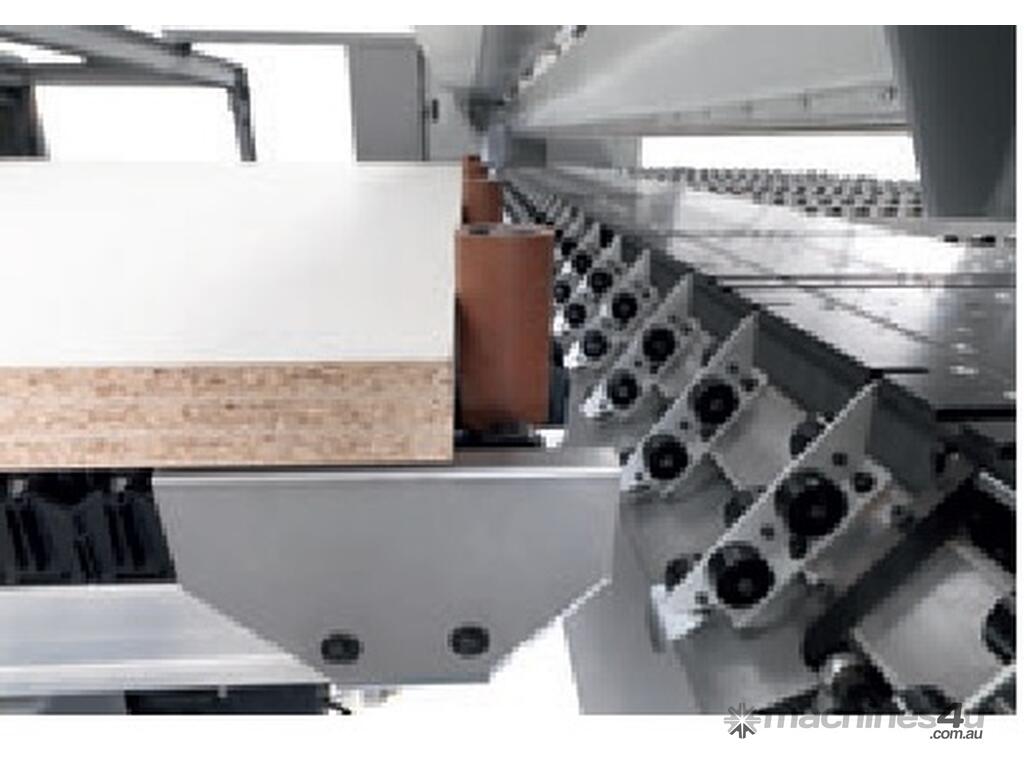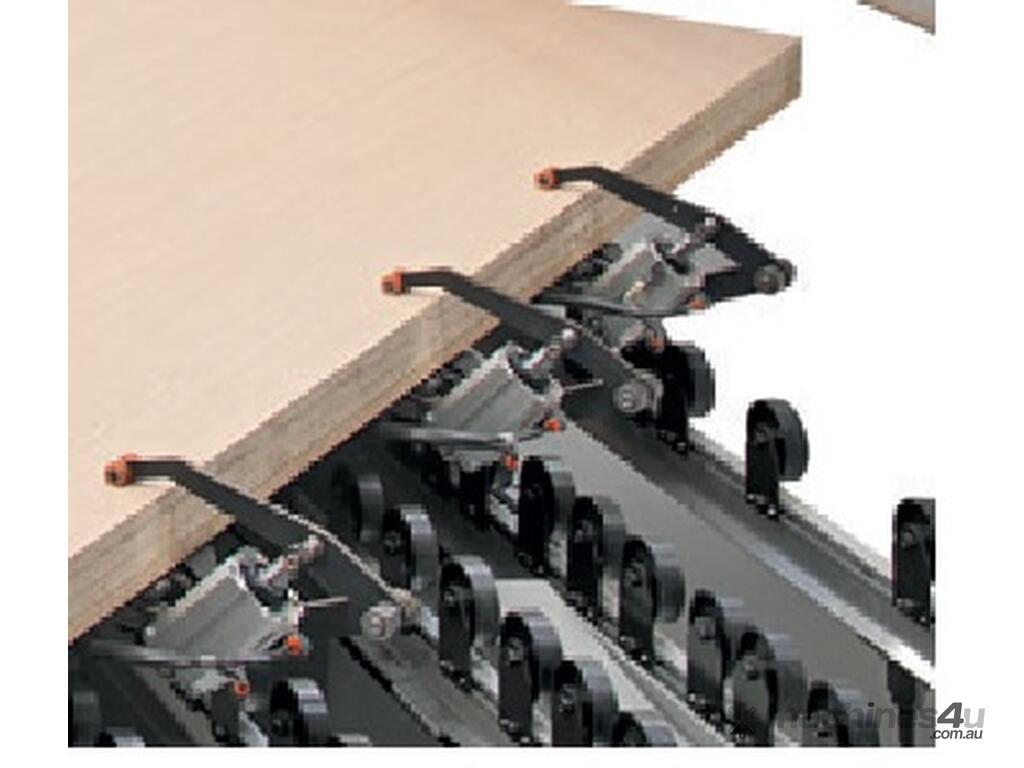 Significant reduction of processing times thanks to the possibility of combining the grippers with any type of cutting patterns in a single cycle. Device for simultaneous execution of staggered cross cuts, made with two completely separate pushers. Each pusher can choose to select two idle slave grippers (not powered) completely independently, based on the strips width to be cut. This enables the processing of panels up to 4500 x 2200 mm.