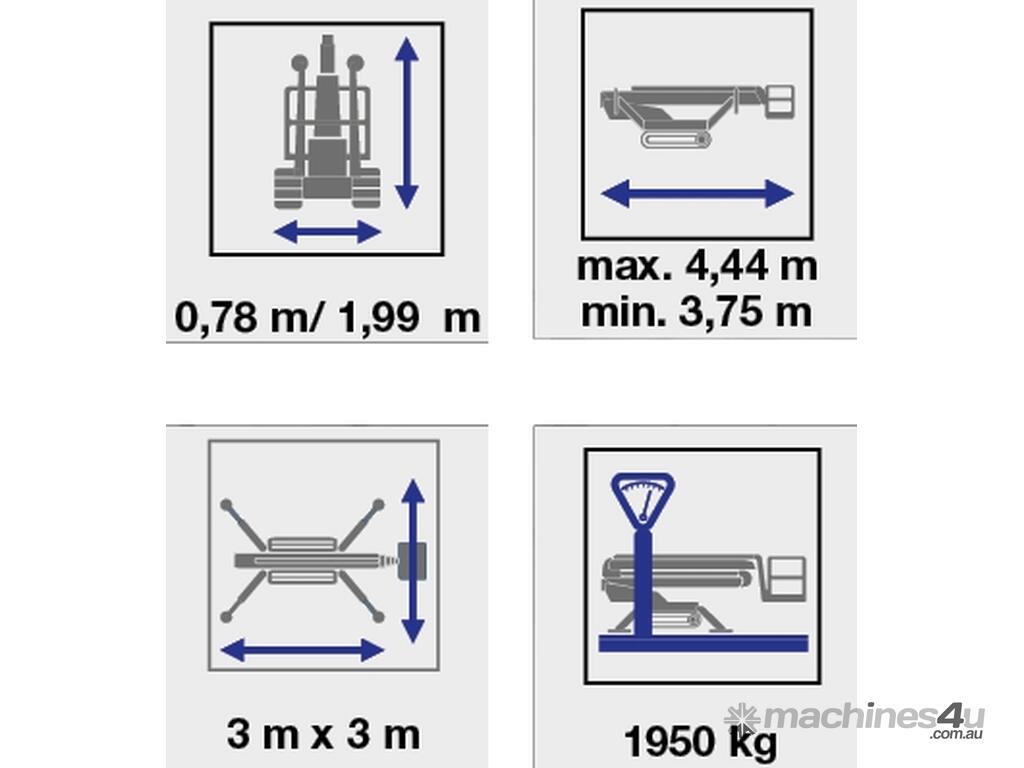Max Horizontal Outreach 7.0 m/230 kg, 7.5 m/200 kg, 9.3 m/120 kg