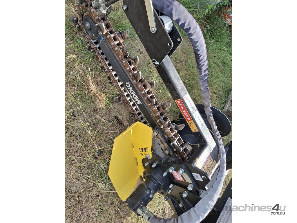 Comes with Daken four in one bucket, two grapples, spreader bar, and Digga Bigfoot trencher with 90 cm digging depth. Perfect for farm work, landscaping, trenching, and property maintenance.