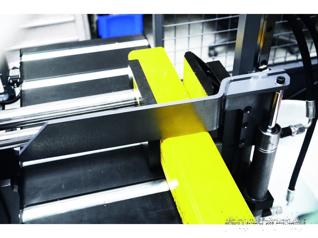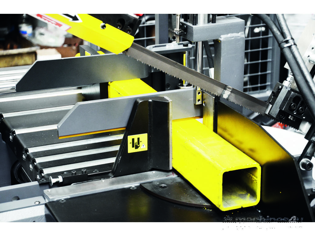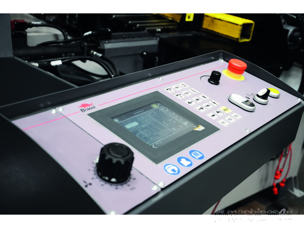 Bomar Ergonomic 320.258GANC is a powerful automatic band saw for angular cuts in the range of 0° - 60° with a heavy saw frame of vibration-proof cast alloy, with a powerful industrial engine and spiral gearing running in an oil bath. Precise hard metal saw band guides, saw head pivot embedded in pre-stressed conical bearings, a 27mm saw band and a synchronic swarf brush are the prerequisites for excellent cutting performance. The machine is equipped with an automatic cutting pressure regulation system. The feeding length is 600 mm in one step and it is measured by a linear measuring system with high resolution (precise piece lengths). The floating vice is guided by two hardened guides bars with linear ball-recirculating bearings. The consistent roller conveyor provides for simple material feeding and it is a safe basis also for short pieces. Angular cuts can be up to 45° in the automatic cycle, up to 60° in the semi-automatic mode. The performance of the hydraulic drive is so high that short auxiliary times can be achieved with the double pump and the proportional valve control. An advanced CNC control with simple dialogue-guided operation and a four-lines illuminated text display enable saving of several combinations of lengths and numbers as well as repeated feeds up to 6000 mm. The machine is prepared for the use of a broad range of accessories as roller conveyors and stops, minimum-amount lubrication system, Laser Liner, bundle-clamping device, smooth speed regulation are available, Machine is equipped with Laser Liner, Cut control unit, Wash down Gun as standard