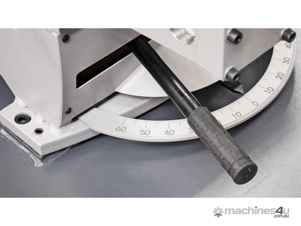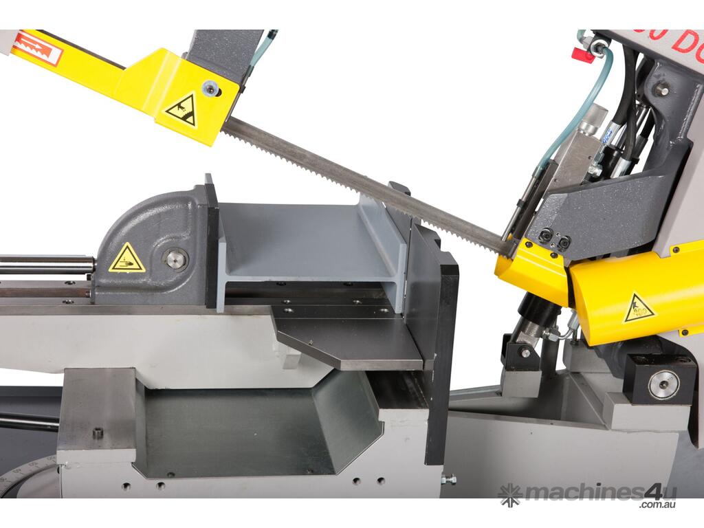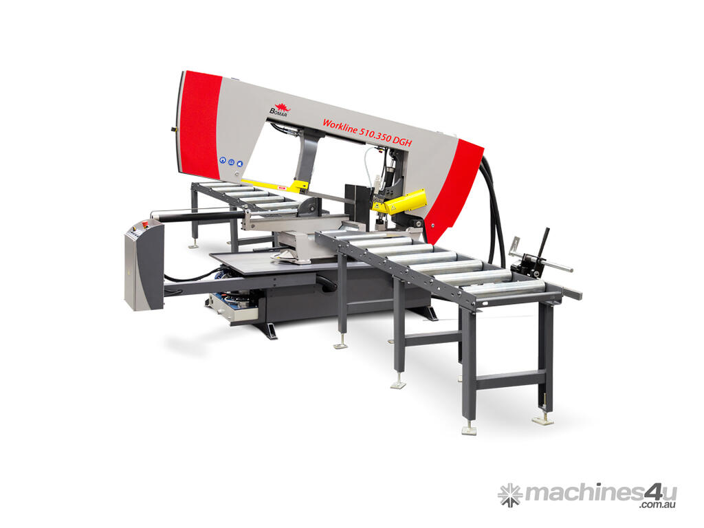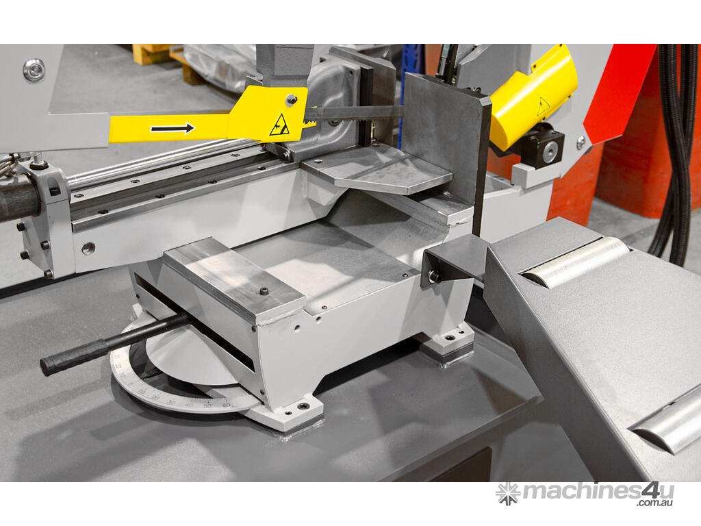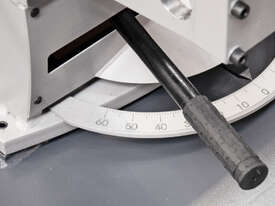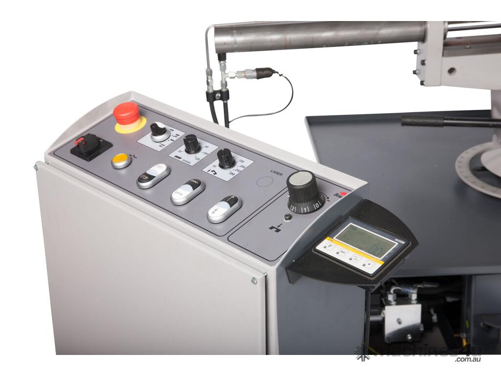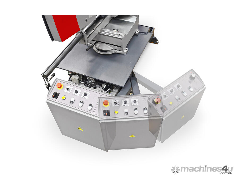 Metal band saw Workline 510.350DGH is a hydraulic semi-automatic machine with cooling located in its base. Angle cuts can be performed on both sides in the range of -60° / 0°/ + 60°. The sawing head turning is performed manually. Machine control and adjustment of angle cuts can be done very easily from the operator’s position. The saw is located on the turning console equipped with legible angle scale. Variblel speed of the saw band is 20-120 m.min-1. Material feeding into the cut is manual. The saw can be easily controlled via controllers located on the control panel (see the picture).