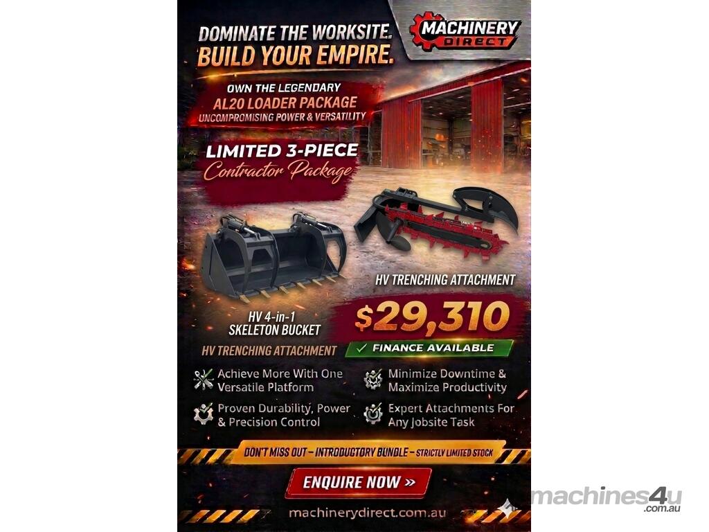 Brand New Ozziquip AL20 Mini Loader 4-in-1 with Tencher 3-Piece Package :      $26,645 AUD($29,310 Inc. GST)