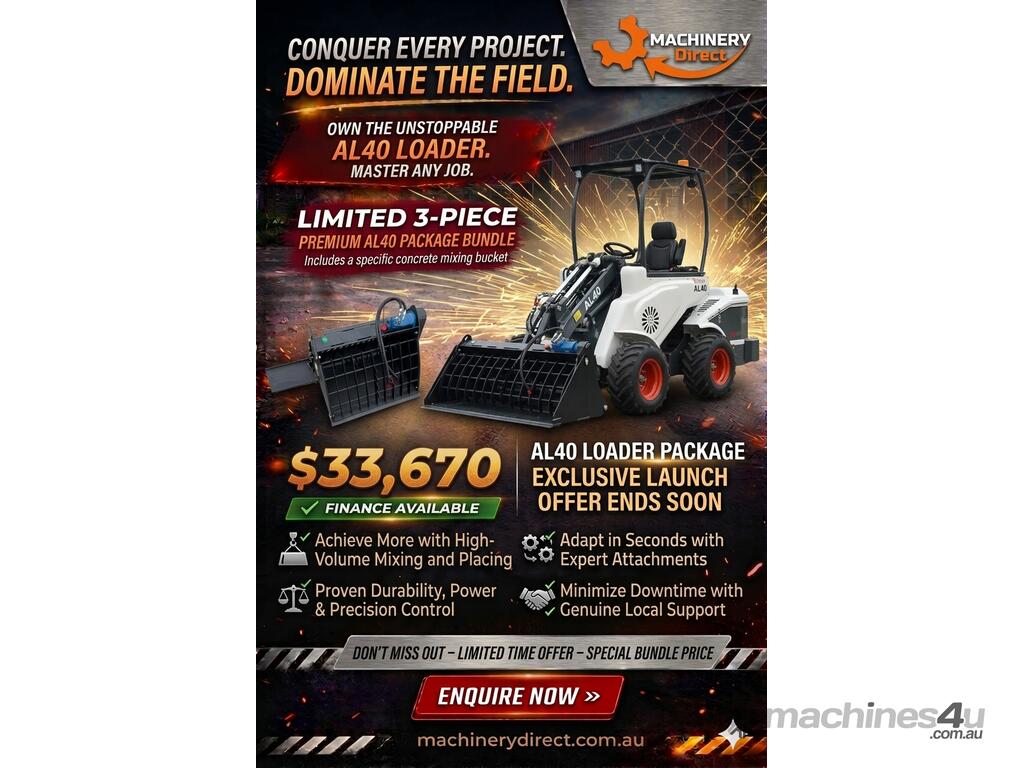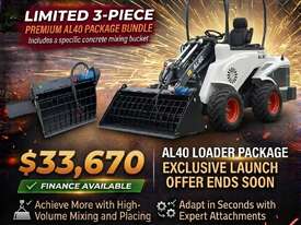 Brand New Ozziquip AL40 Mini Loader 4-in-1 with Mixing Bucket 3-Piece Package :      $30,609 AUD($33,670 Inc. GST)