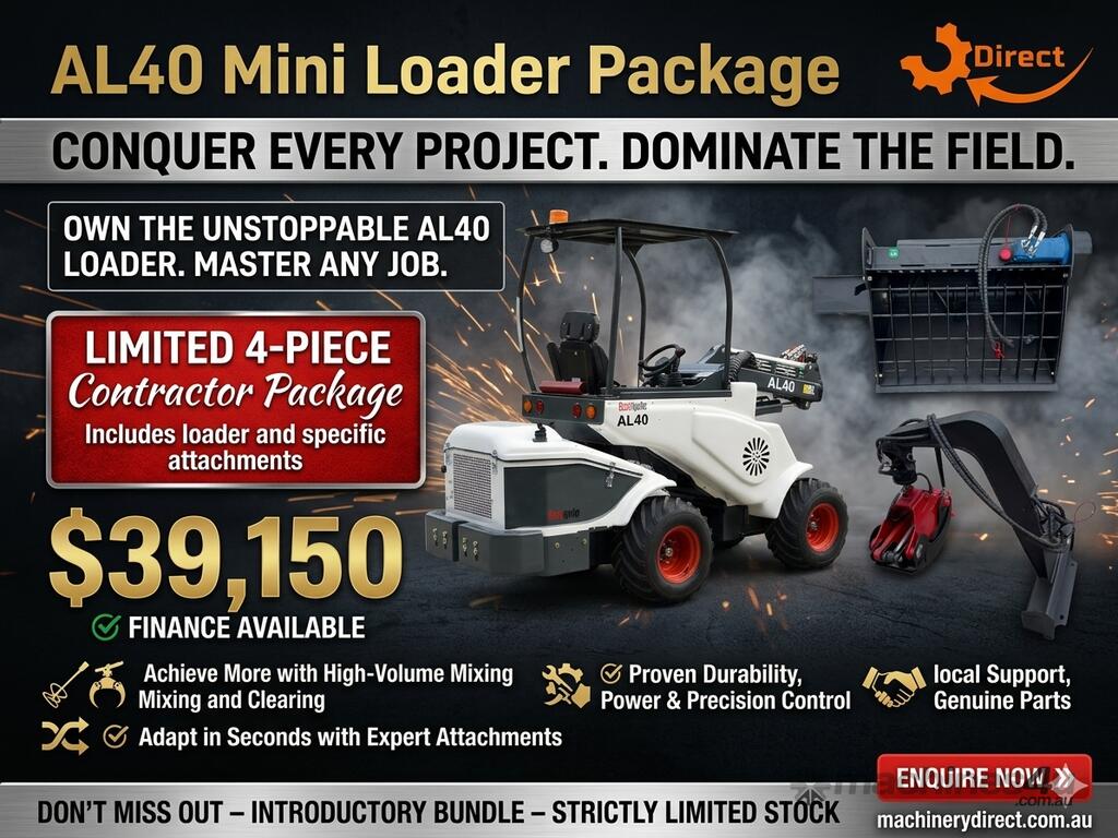 Brand New Ozziquip AL40 Mini Loader 4-in-1 with Mixing Bucket & Wood Grapple 4-Piece Package :      $35,591 AUD($39,150 Inc. GST)