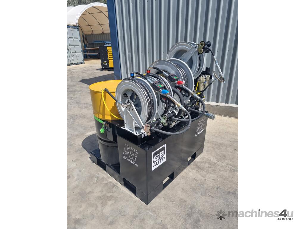 > [Optional] 20kg GREASE SUPPLY pump set with mounted hose reel, pump, and nozzle.