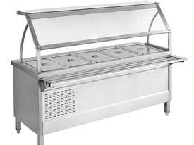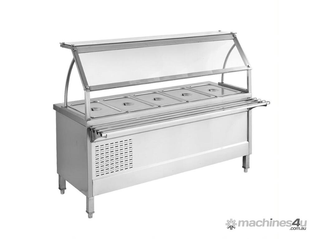 Refrigerated • 2 to 8°C ALL STAINLESS STEEL 5 × 1/1 GN pans • 600 mm High Solid glass top & sides • 1/1 GN pans × 100 mm deep included • Auto defrost • Automatic condensation evaporation • digital temp. controls & read-out • Ambient 33ºC & 75% RH Cold tops are holding units & product needs to be pre-chilled to less than 5ºC before filling. Depth: 950 mm | Width: 1900 mm | Height: 900-600 mm | Power: 240V; 320-350W | Net Weight: 158 | Price: $5149 | Manufacturer: F.H.E