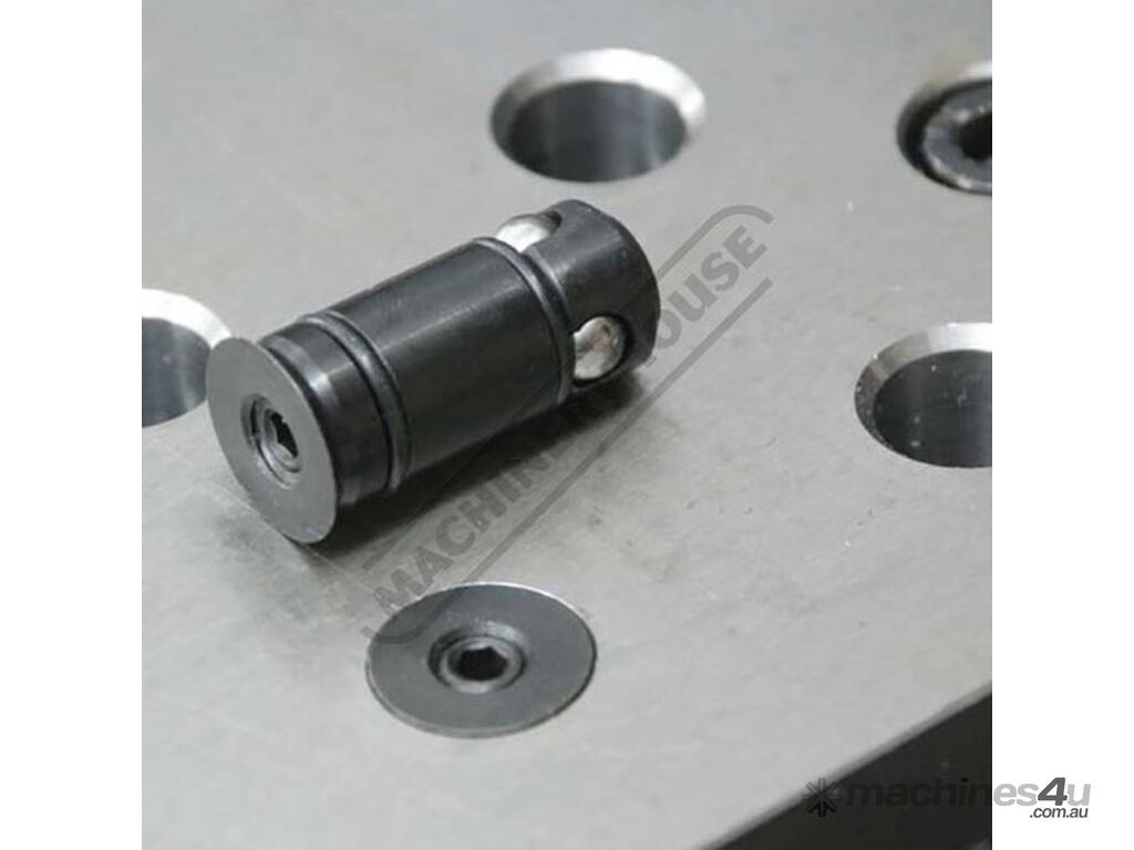 - When engaged (tightened) three steel locking balls move outward to lock underneath the table, securely attaching fixturing elements to the table with downward pressure.