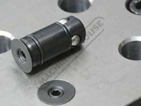 - When engaged (tightened) three steel locking balls move outward to lock underneath the table, securely attaching fixturing elements to the table with downward pressure.
