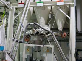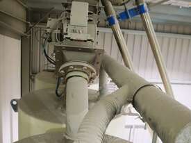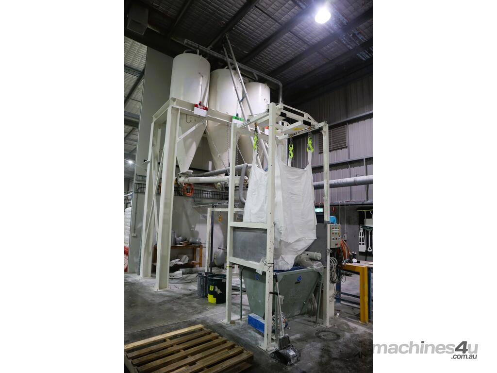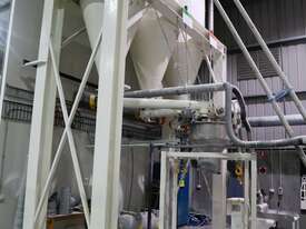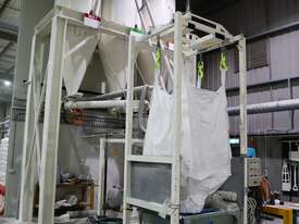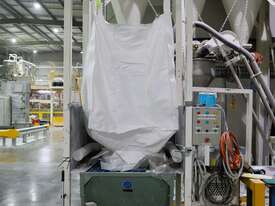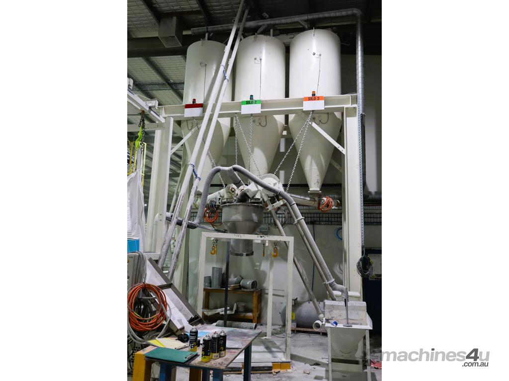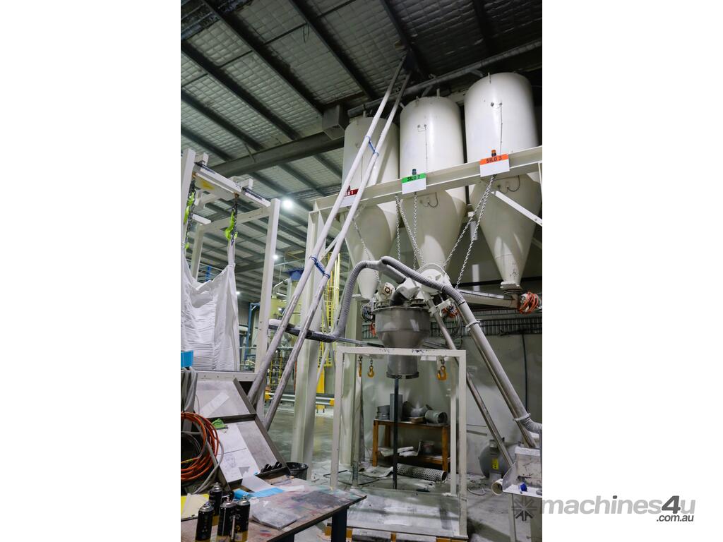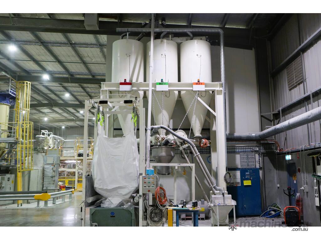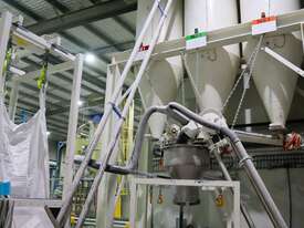 Efficiently blend and batch powders or granulates from three silos into a single bulk bag. Each silo feeds into a central hopper, weighed, and then a bagged. The system allows any combination of silo contents to be discharged in controlled quantities for custom mixes. Once the target blend is achieved, the product is automatically filled into a bulk bag, ready for transport or processing.