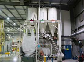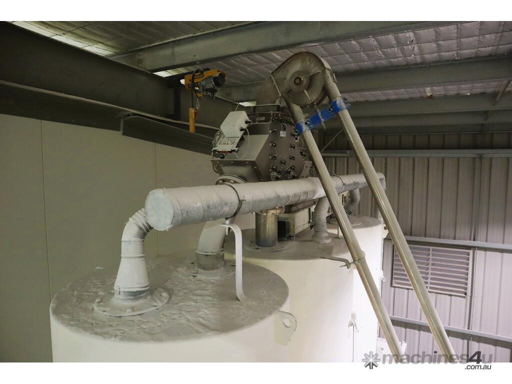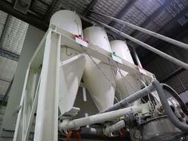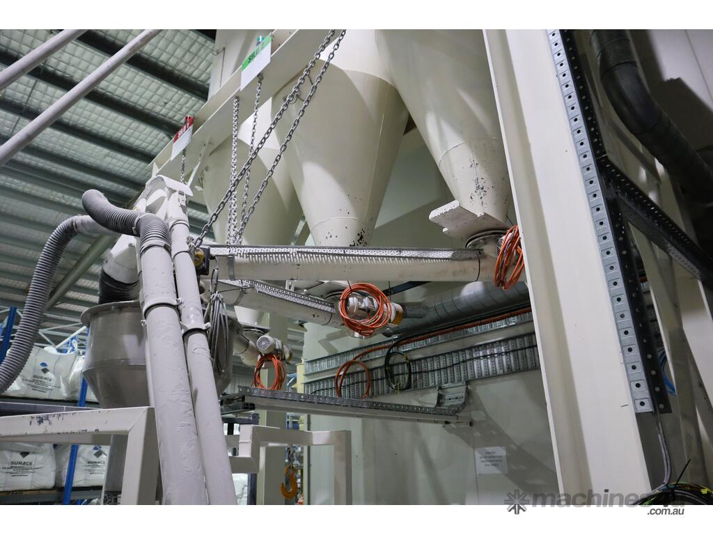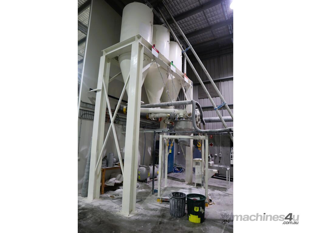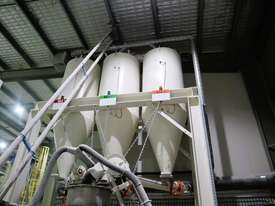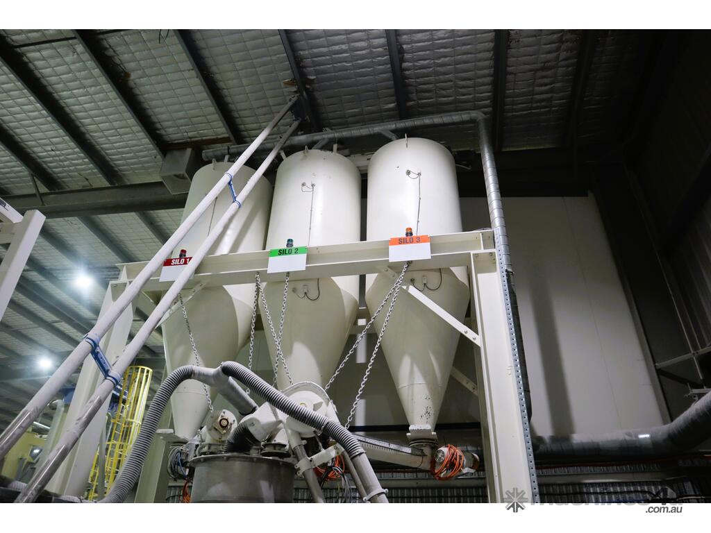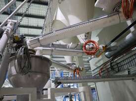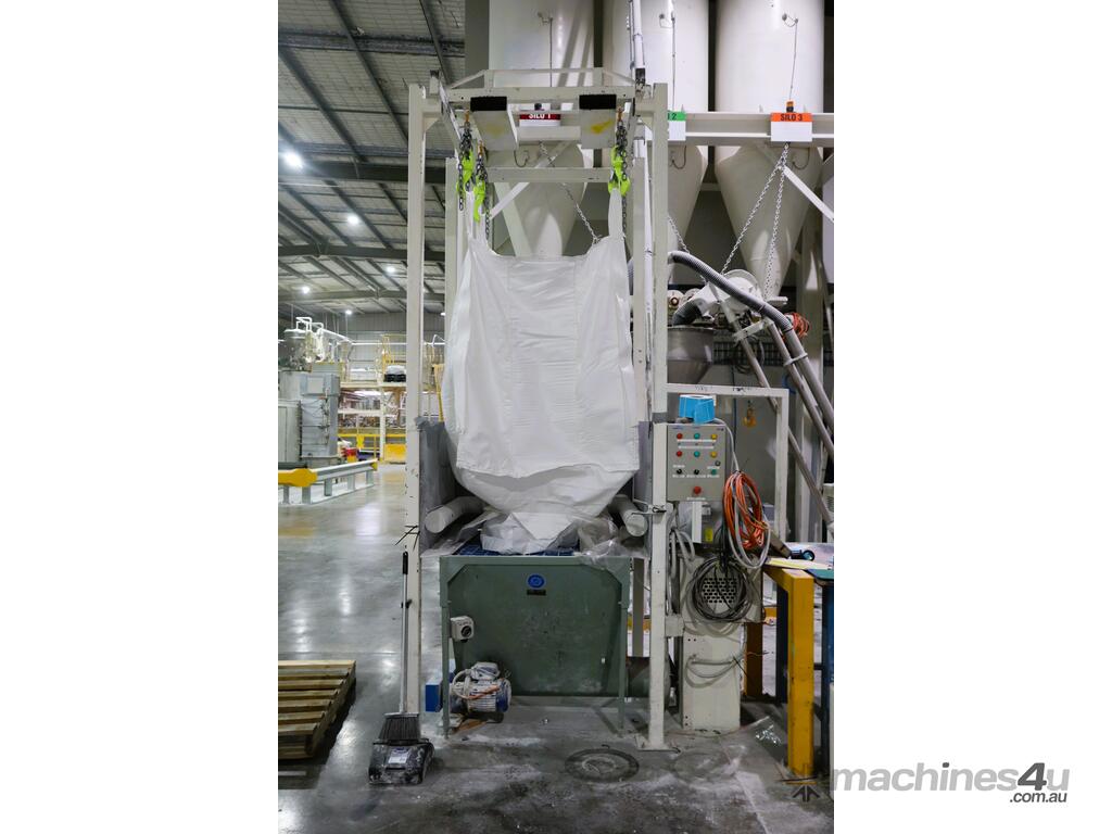 Efficiently blend and batch powders or granulates from three silos into a single bulk bag. Each silo feeds into a central hopper, weighed, and then a bagged. The system allows any combination of silo contents to be discharged in controlled quantities for custom mixes. Once the target blend is achieved, the product is automatically filled into a bulk bag, ready for transport or processing.