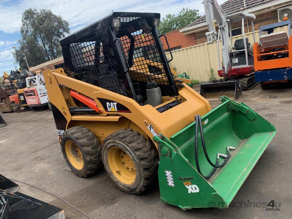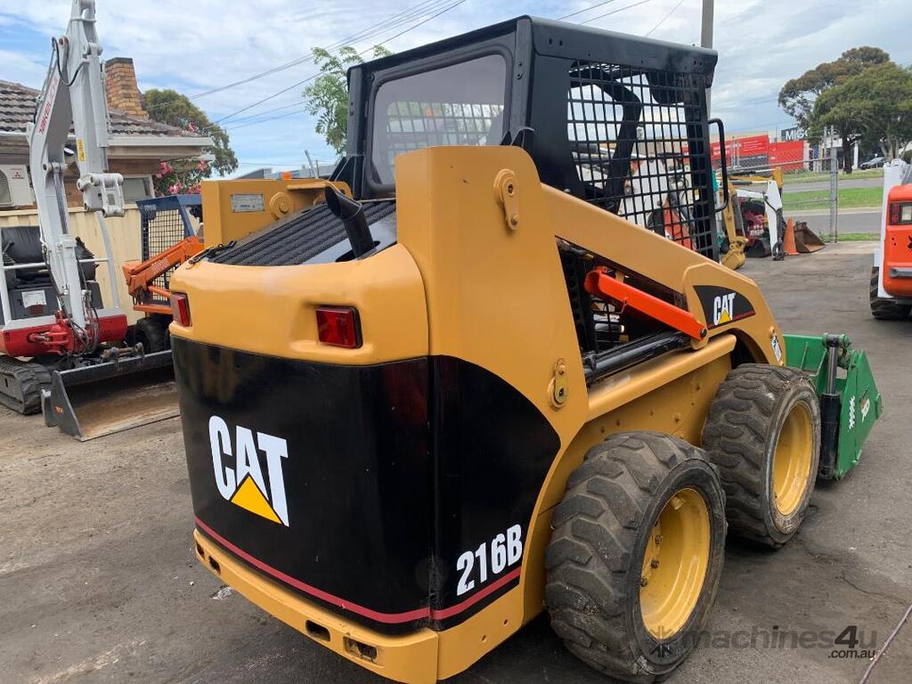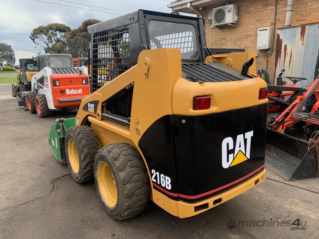 Caterpillar 216B Skid Steer Loader, , s/n. 4NZ01318, 2.5 tonne, 49 HP, auxiliary hydraulics variable flow, rubber solid tyres with suspension holes, 4 in 1 bucket, joy stick hand control drive and lift-tilt-open bucket, low hours, hour meter has been broken and changed new one that start by 0.0, new seat, new battery, $28,950.00 + GST