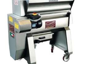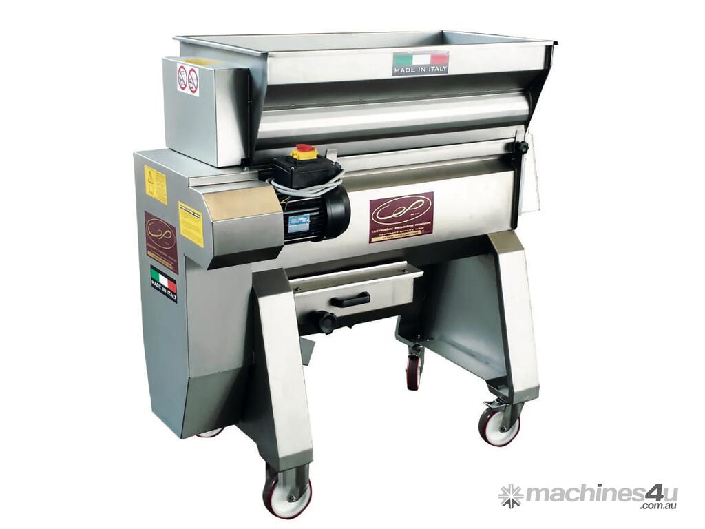 Destemming-crushing machines with rubber food rollers. The pair of rollers ensures gentle squeezing of the grapes as standard on all models. The destemming shaft is made with rubber blades. The destemming cage is made from stainless steel with grooved holes. The machine is equipped with a central opening and cage extraction, thereby facilitating simple and complete cleaning.