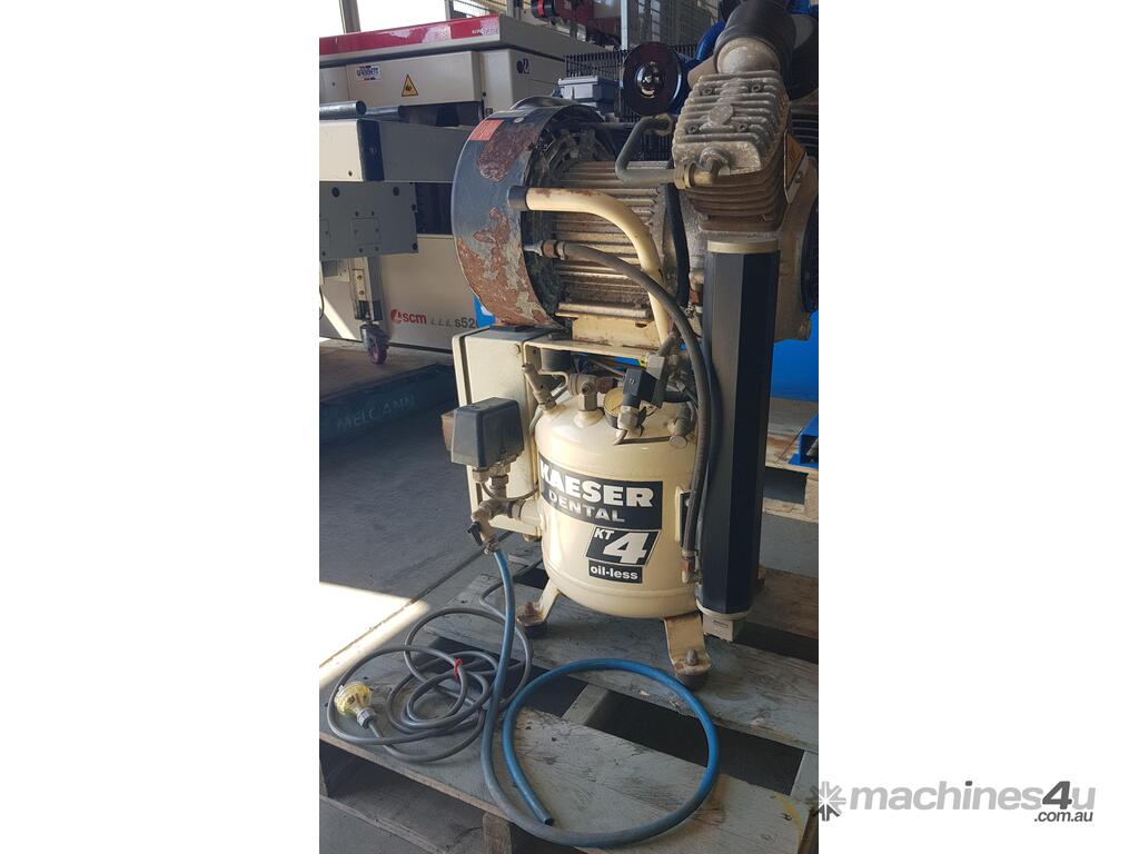 4). KAESER KT-4 DENTAL OIL-FREE 1.1kw 1.5hp 240v AIR COMPRESSOR Year 2000, BUILT-IN SECCOMAT DESSICANT AIR DRYER, AFTER COOLER, PERMANENT POWER SYSTEM (PPS) PROVIDING INTERNAL COOLING AND LONGER PUMP LIFE, DIRECT DRIVE MOTOR, AIR TANK, PORTABLE, 2 x CARRY HANDLES, MADE IN GERMANY, COMPACT, VERY QUIET, GOOD ORIGINAL CONDITION (SOME SURFACE CORROSION). TESTED 100%