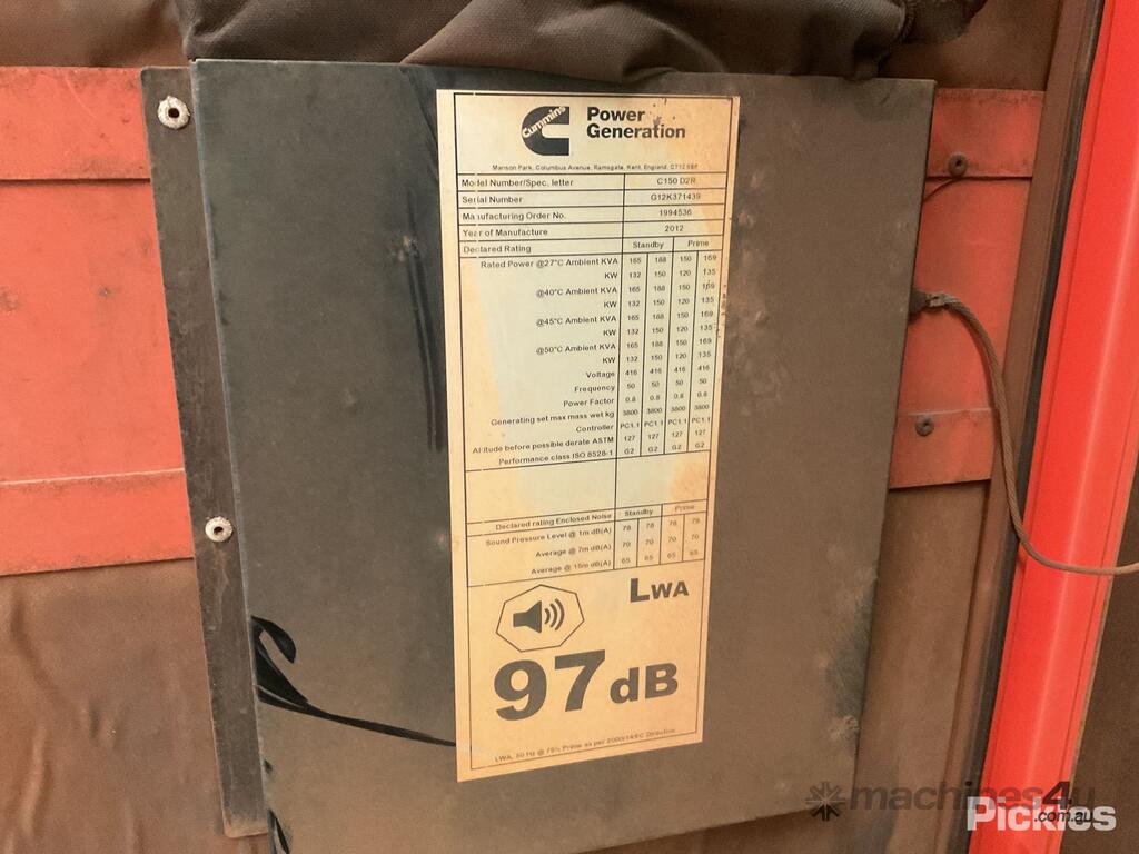 CIRCA 2012 Cummins Power Generator C150D2R Genset With Lifeguard 34 Generator Switchboard - 150kVa,Approx Dimensions - 4300mm (L) x 1750mm (W) x 2400mm (H), Fire Extinguisher, Tyne Pockets, Used/General Wear & Tear, Untested & Unknown Working Condition.