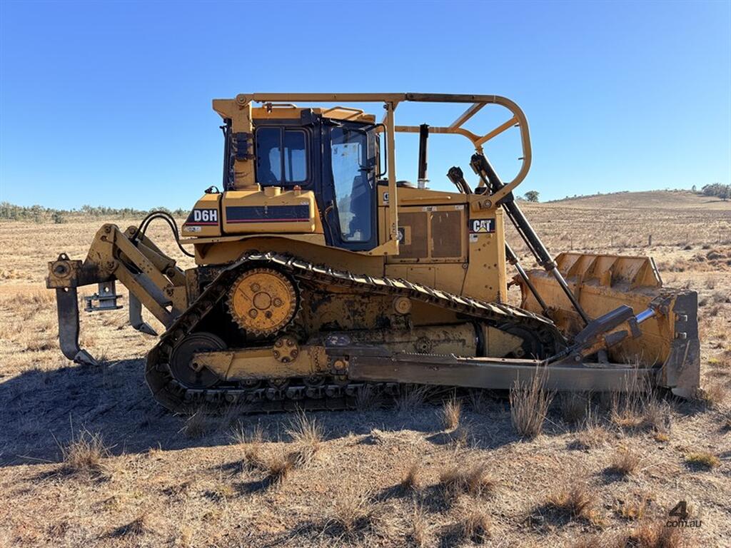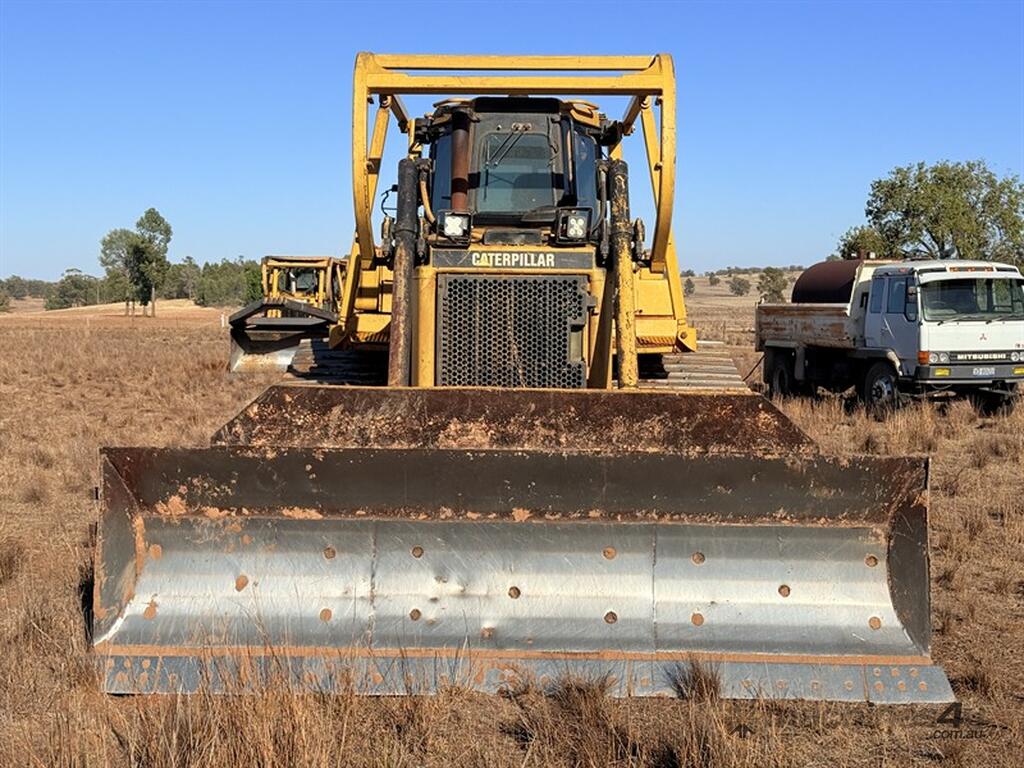 Circa 1990 CATERPILLAR D6H AND STICK RAKE, PIN: 4GG00358. Ripper tynes x 3, QMW Industries Ropes Scrub Canopy, flat blade with tilt ramp, air conditioned. Chain and sprockets are approximately 60%, equaliser bar repinnned and bushed approximately18 months ago, replaced draft pivot around the same time. Assortment of parts included in sale. Located Parkes, NSW