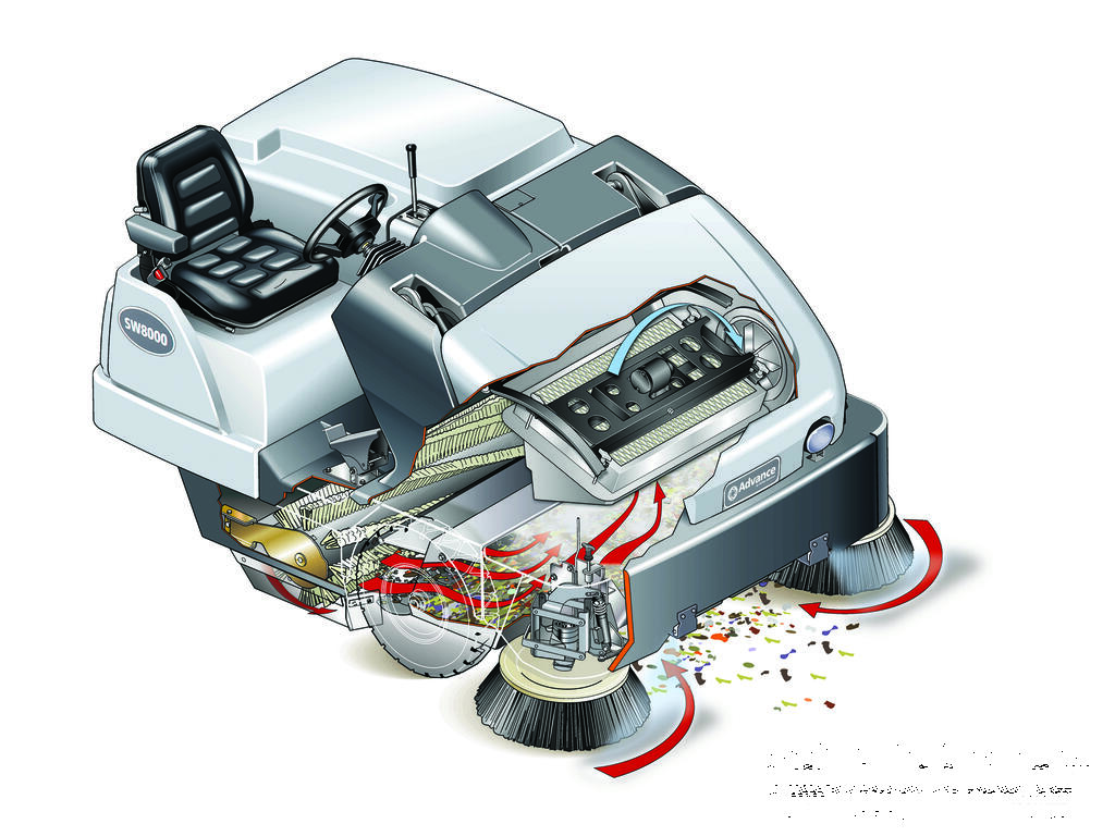LPG Ride On Sweeper, features; The SW8000 is designed with attention to details that matters to you such as better safety features, easier operator control, simple maintenance and function features that provide better performance, reliability and a lower total cost of cleaning.