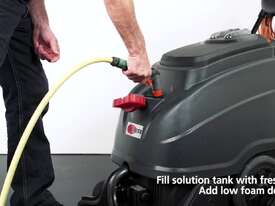 The machine is equipped with large capacity tanks; 35L solution and 23L recovery made of ridged, chemical resistant and environmentally friendly polyethylene. The handle can easily be adjusted for different operator heights to obtain an ergonomic working position.