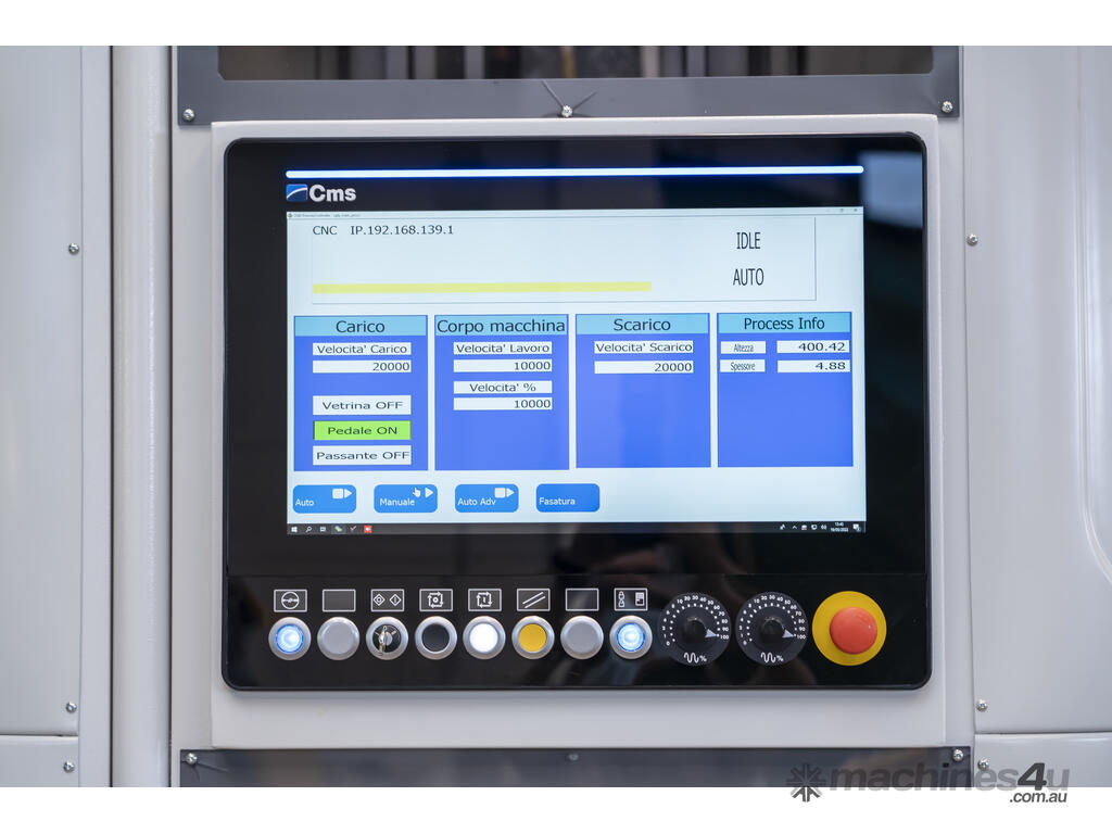 - The operator loads the glass and starts the processing cycle, the machine automatically measures the incoming glass (height, length and thickness) and machines the edge.