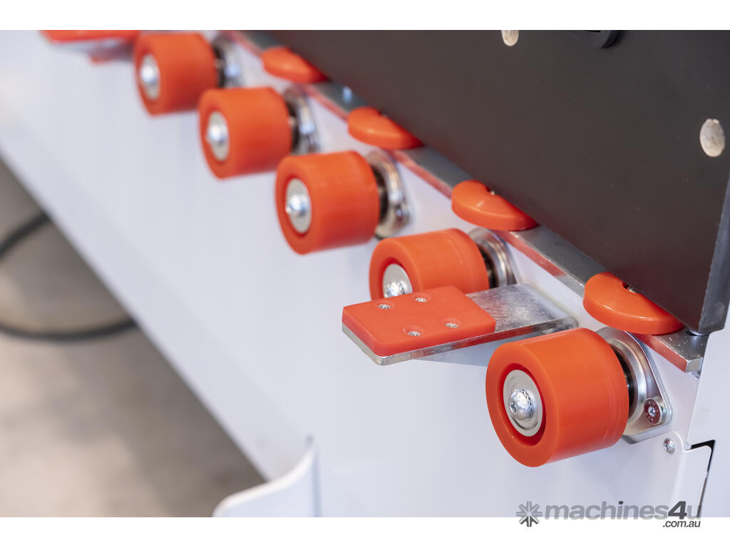 - Motorized roller conveyors can be installed to lengthen both the machine infeed and outfeed. Each roller conveyor measures 2500mm, allowing glass with lengths up to 6m to be machined. The outfeed roller conveyor is also equipped with a dual motor drive that can act as a buffer.