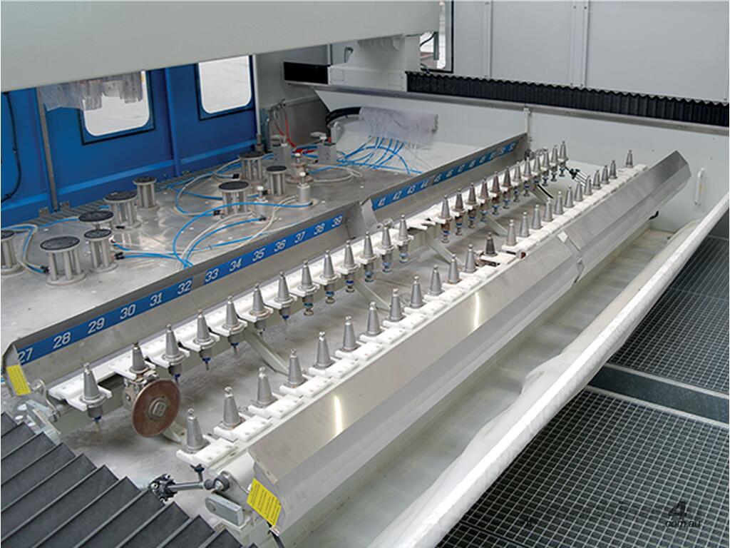 The wide modularity of the tools rack allows  to adapt the table to each need. The warehouses can be installed rear, side or also under the beam for a tool change in less than 10 seconds.