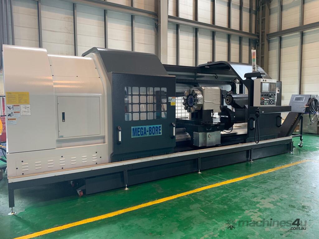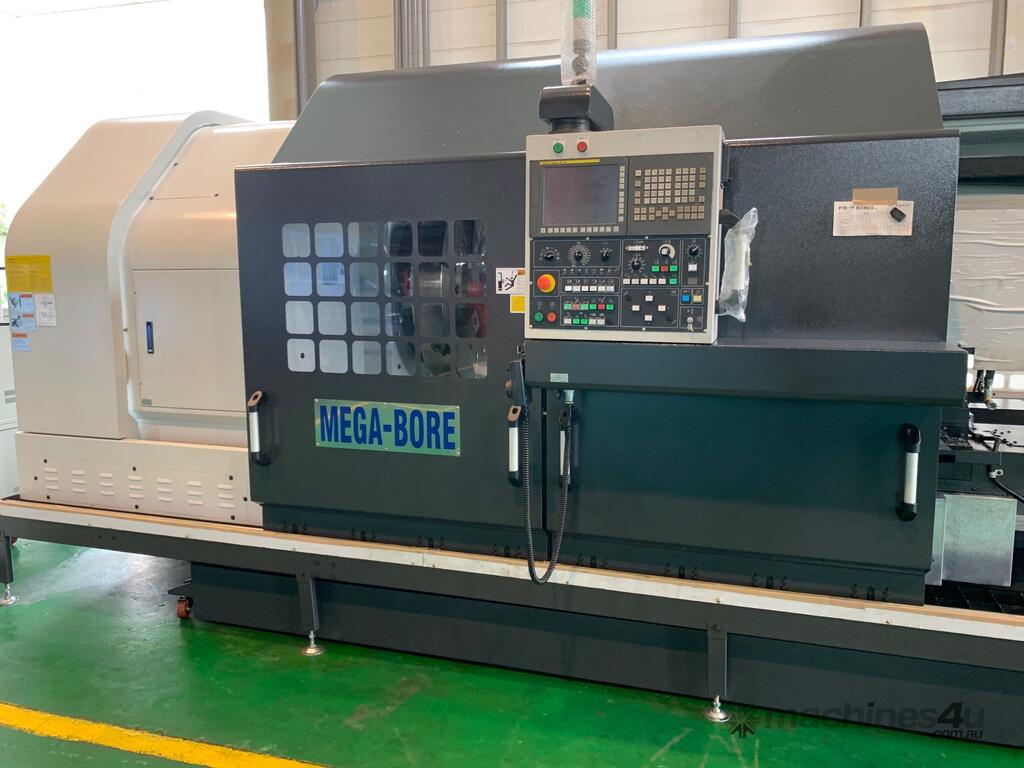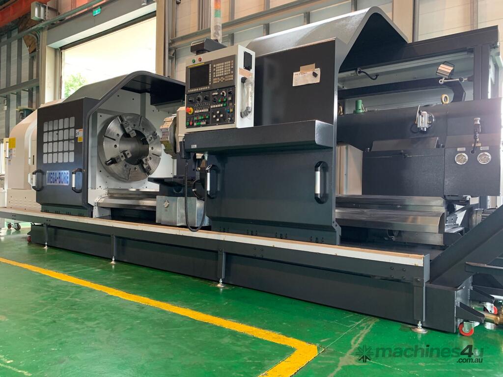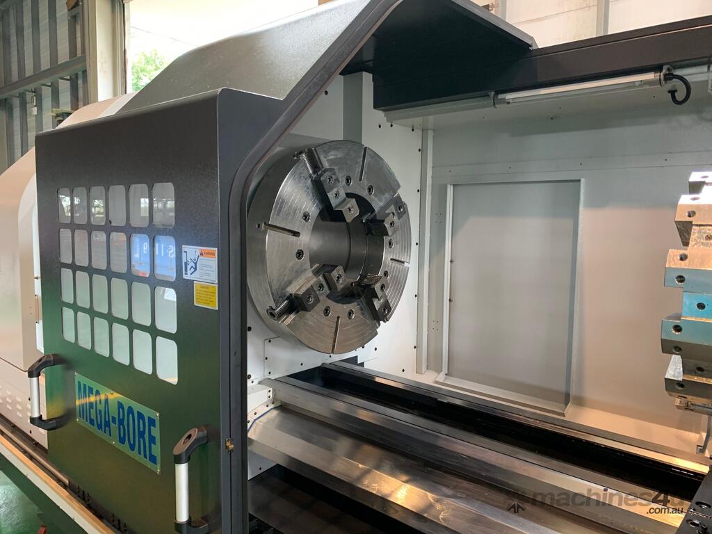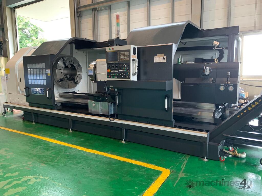 The Megabore LC series is a flat bed configuration CNC lathe that offers an economical price with large capacity. One of our best selling machines, and comes in several center heights and spindle bore options. Starting with the LC35 (Swing in inches) and from 6in (150 mm) to 22ins HS. Features. * One piece bed, floor type casting. * Alloy steel spindle with opposed taper roller bearings. * All gears in the headstock are hardened and precisely ground. * Automatic ranges of spindle speed through pneumatic gear shift. * Spindle speed ranges are automatically changed by M code. * Infinitely variable speed are commanded by S code. * Tool change are commanded by T code. * Auto lubrication system is equipped for headstock, carriage, and cross-slide. * Precision tapered roller bearings are equipped on the spindle and the quill. * The quill is heat treated and precisely ground. * Internal taper of quill to suit MT#6 dead center or live centre. * Turcite B anti friction material is applied on cross slide and carriage for reduce friction. * X and Z axis ballscrews are protected by covers to prevent ingress of swarf / chips and coolant. Contact us for a quotation.