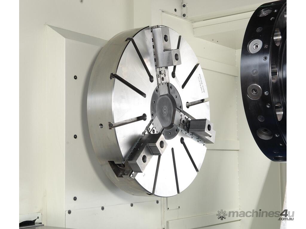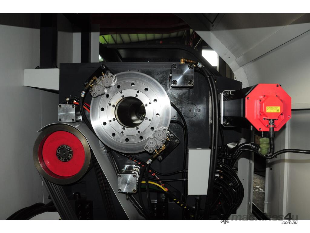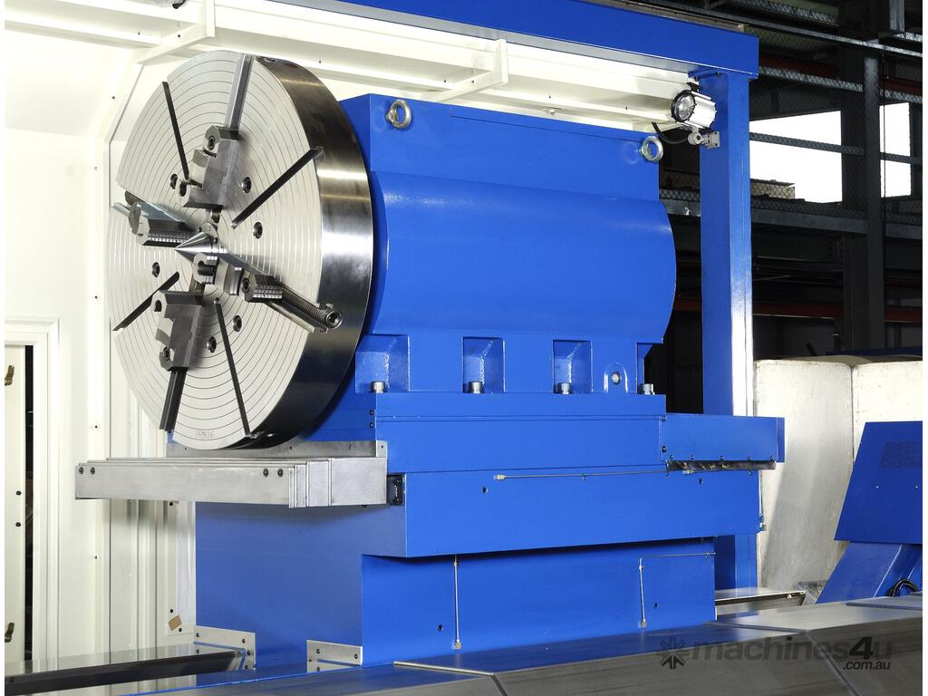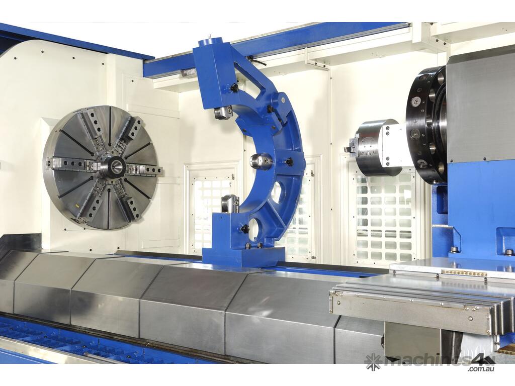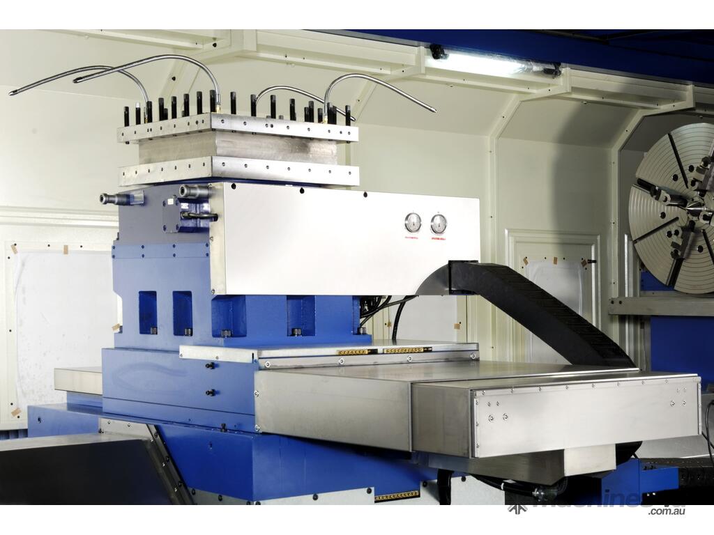 The latest in the product range from Megabore, the base machine can be configured in many ways to suit client requirements. BED WIDTH : 1350mm (53.14") Model No. denotes approx.swing over bed in inches. One Piece Meehanite Cast Iron Bed for Extreme Rigidity and Maximum Stability During Heavy Machining. High Torque 4-Stage geared headstock with an integral oil bath refrigeration system to maintain normal temperature at high speed. Precision Hardened and Ground Slideways and High Precision Ball Screws.Baruffaldi servo driven turret for a fast tool change of only 1 second. Fully enclosed splash guard for ultimate operator safety. Programmable tailstock for convenient operation. Fanuc (Or client request) Control System for simplicity & reliability, together with linear scale feedback for accuracy. Outstanding Features * One piece bed, floor type casting. * Alloy steel spindle with opposed taper roller bearings. * All gears in the headstock are hardened and precisely ground. * Automatic ranges of spindle speed through pneumatic gear shift. * Spindle speed ranges are automatically changed by M code. * Infinitely variable speed are commanded by S code. * Tool change are commanded by T code. * Auto lubrication system is equipped for headstock, carriage, and cross-slide. * Precision tapered roller bearings are equipped on the spindle and the quill. * The quill is heat treated and precisely ground. * Internal taper of quill to suit MT#6 dead center or live centre. * Turcite B anti friction material is applied on cross slide and carriage for reduce friction. * X and Z axis ballscrews are protected by covers to prevent ingress of swarf / chips and coolant. Photos show some of the many configurations available.