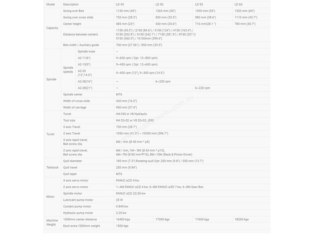 Capacity Swing over Bed 1135 mm (45") 1265 mm (50") 1395 mm (55") 1520 mm (60")