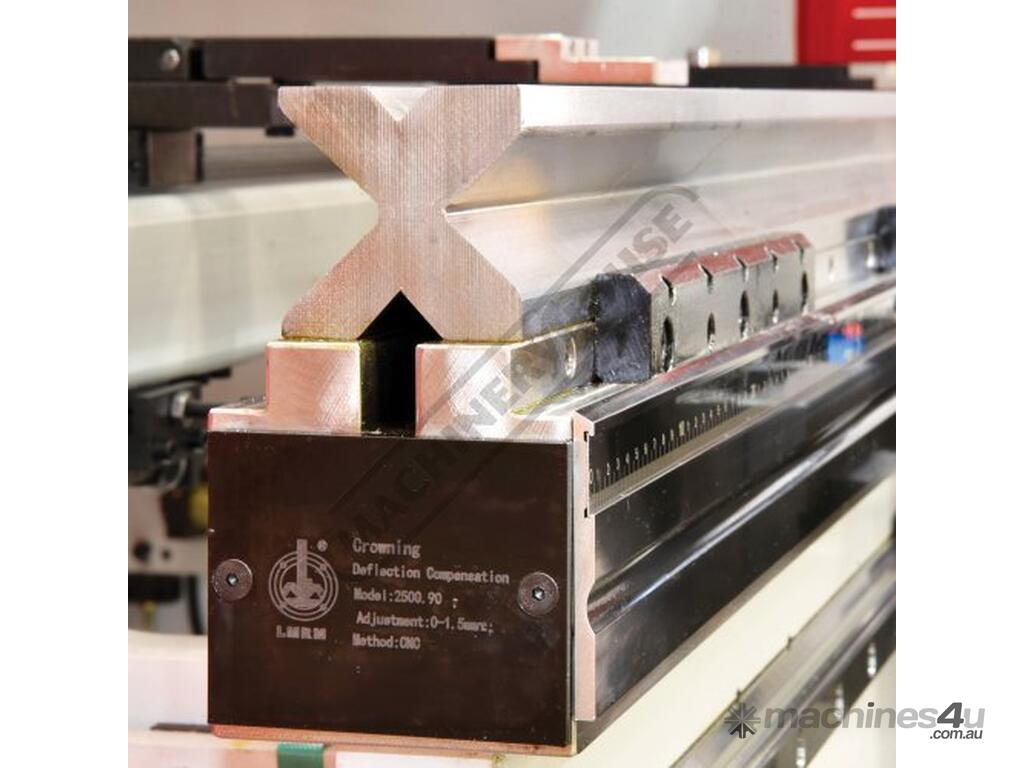 CNC controlled auto crowning table (V) adjusts accordingly based on material length & thickness specified in program.