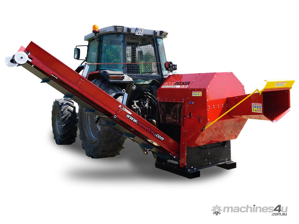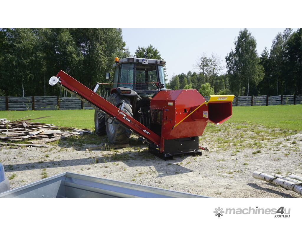 The chipper is equipped with a safety switch and covers to ensure safe operation. The chipper has a system for withdrawing material from the feed hopper. The device is equipped with a 3m or 4m long belt conveyor for discharging the processed material. The shredder is characterized by high efficiency and high comfort of work. The obtained pieces of wood work great as fuel.