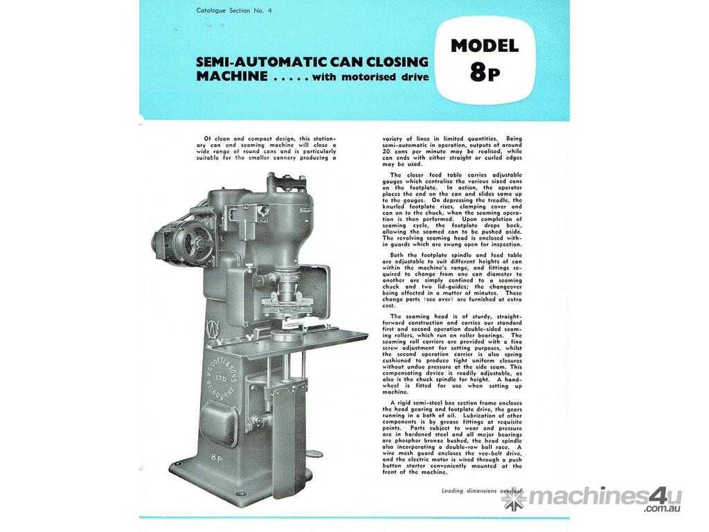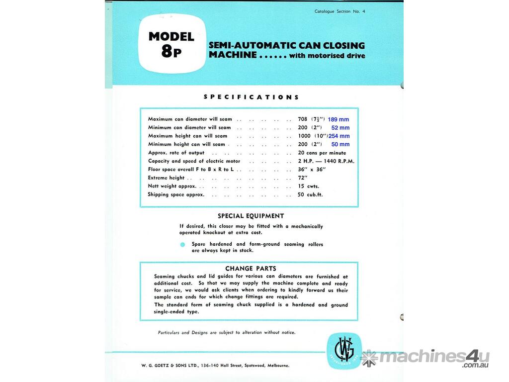 Goetz Can Seamer, model 8P, suitable for cans from 52mm to 189mm dia, with a heigh of 50mm to 254mm, (change parts required) max speed approx 20 cans per minute
