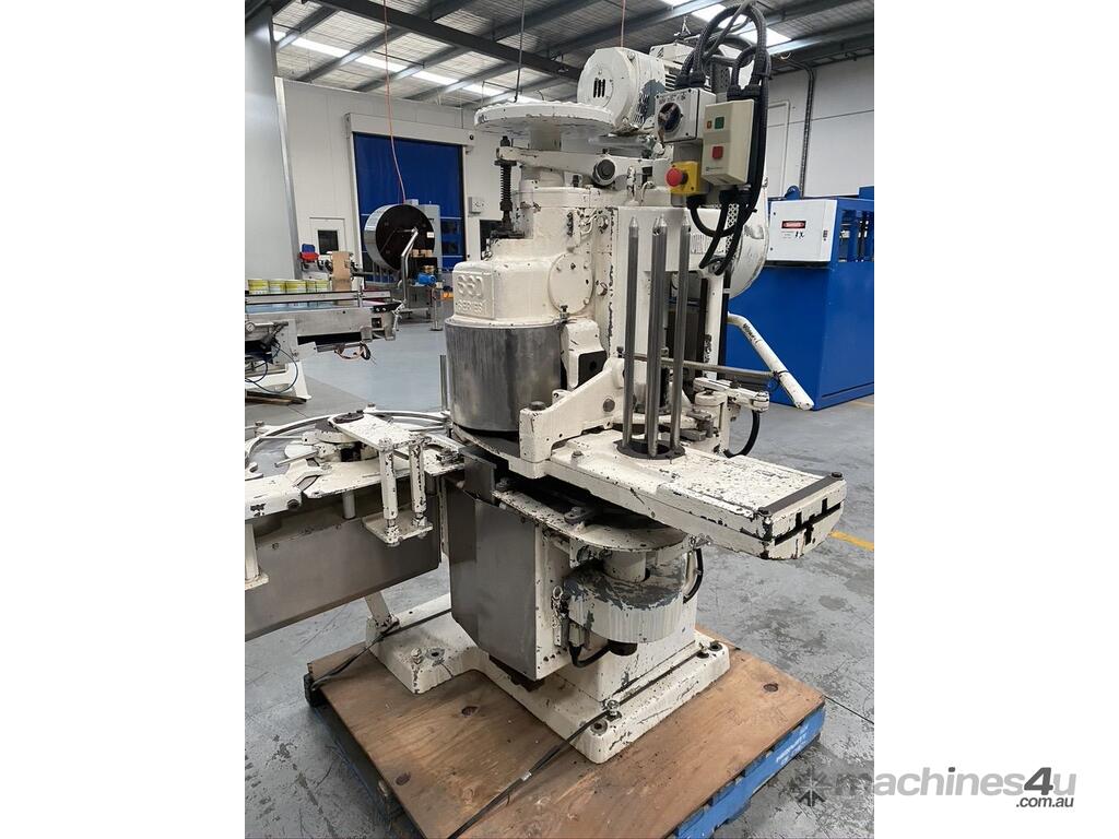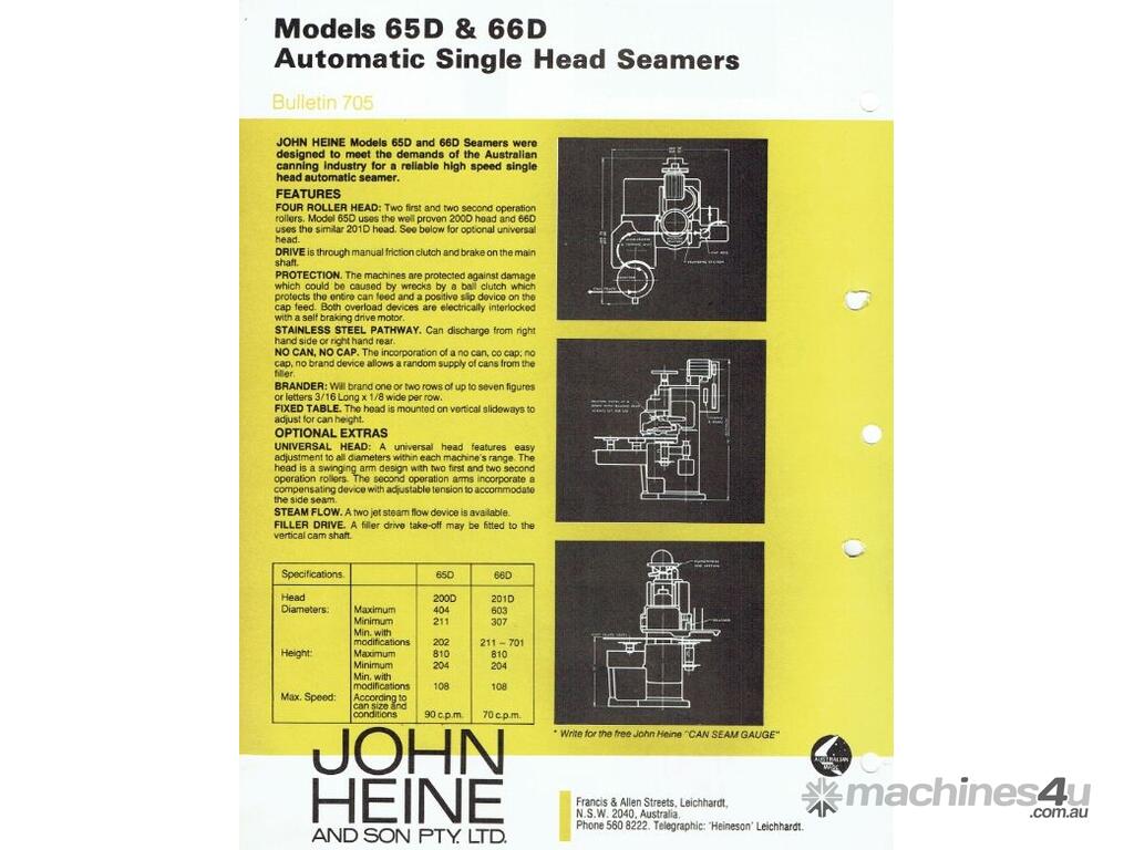 Can Seamer, "John Heine", Model 66D - series 1, Set up for a 65mm dia can, other sizes available up to 99mm dia at extra cost (changes parts made to order) Maximium speed 70 cans per minute, S/N 970