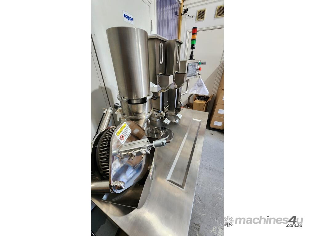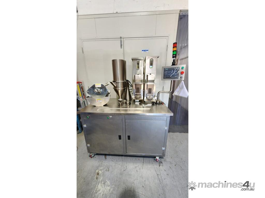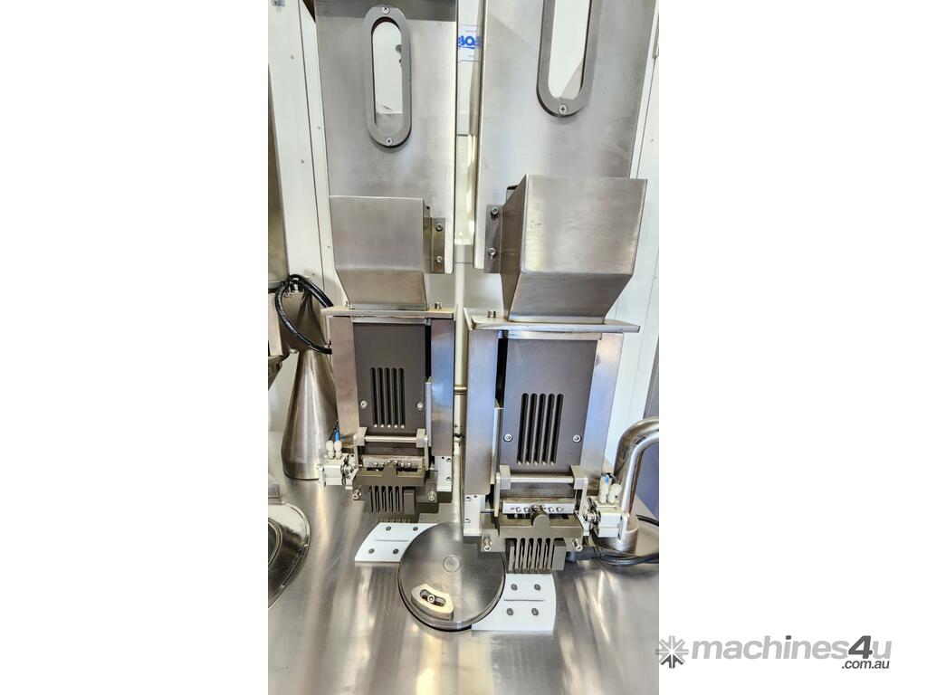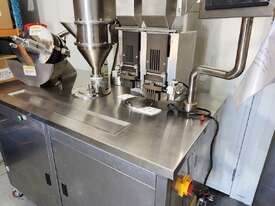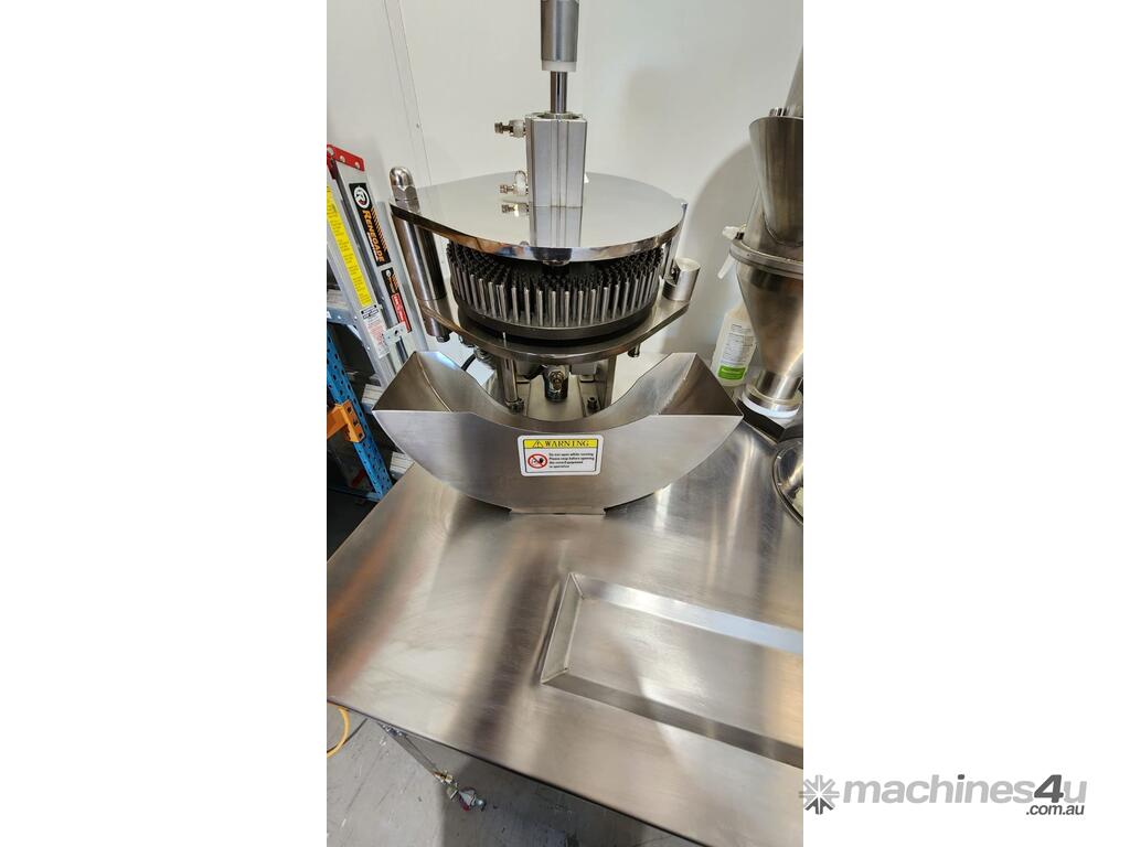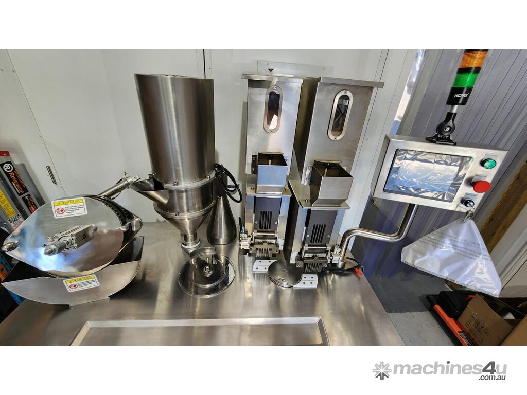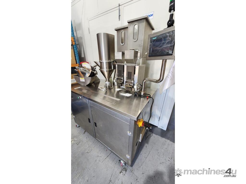 Includes mechanisms for capsule turning, separating, filling, and locking.