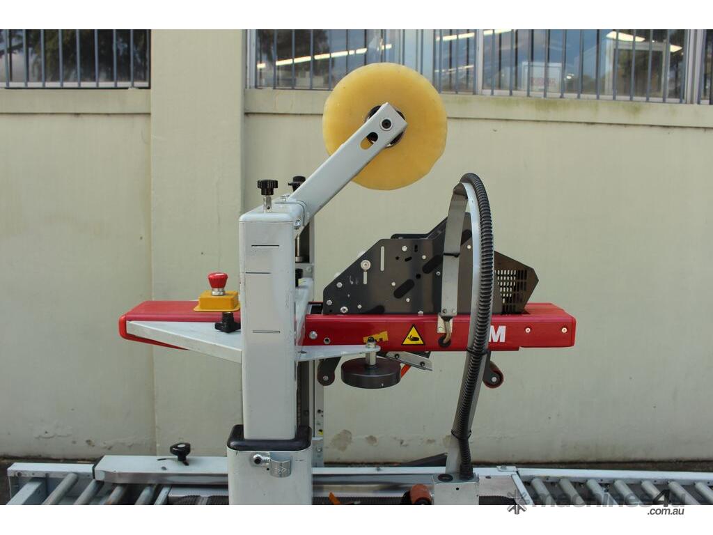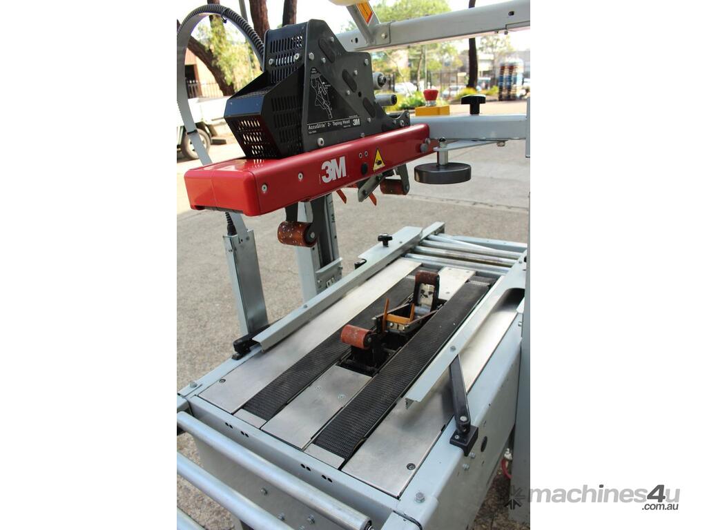 Carton Taper, "3M" Model 200A-I, bottom belt drive case sealer, seals top and bottom of box, range of carton sizes widths 115mm to 546mm and heights 12mm to 622mm, , single phase, with discharge conveyor