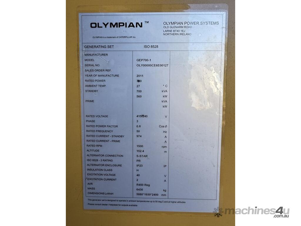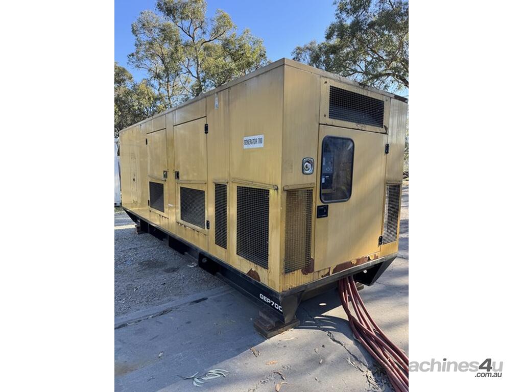 Generator Caterpillar C18 700kva, load tested and ready to use. Fuel tank base, sound reduced canopy with muffler, controller, circuit breaker, block heater and battery charger. Oil make up tank with self filling. Set has done a few hours but has had all components changed that caterpillar recommend for hours. Full service history since new. Pulls full load without a problem. Runs well.