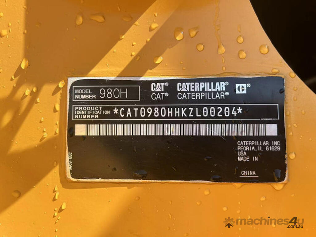 Description: 2013 CAT 980H S/N KZL00204, worked TT 2,950hr. Fitted with EROPS Cab, Spade Nose Rock Bucket, L3 Tyres est. 80% life remaining.