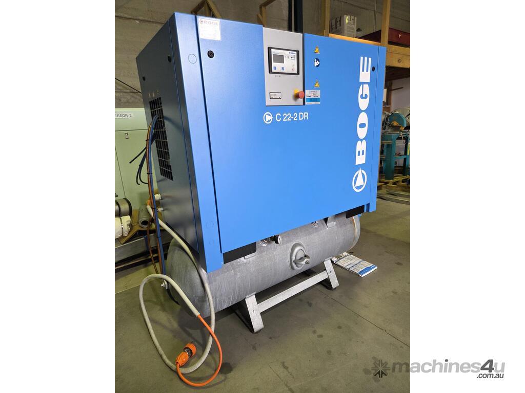 7). BOGE C-22-2 DR-500 22kw 30hp 415v 7.5 BAR 128.5CFM 3-IN-1 ROTARY SCREW COMPRESSOR Year 2022 MADE IN GERMANY INCLUDING BUILT-IN REFRIGERATED AIR DRYER 240v/FILTERS MOUNTED ON 500 LITRE GALVANISED AIR RECEIVER TANK, SUPER QUIET, HEAVY DUTY, GENUINE LOW RUN HOURS. RECENTLY SERVICED, VIRTUALLY ‘NEW’
